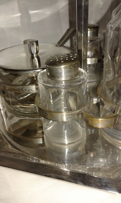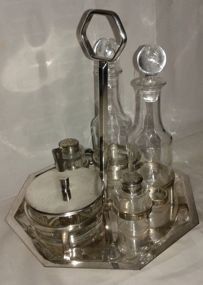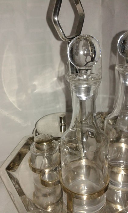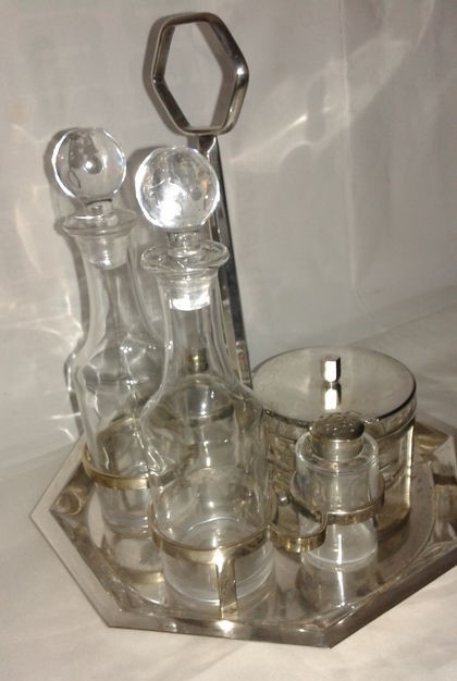 Hermoso juego de vinagrera bañado en plata compuesto por un soporte, dos botellas, dos recipientes para especias y un tazón de queso.