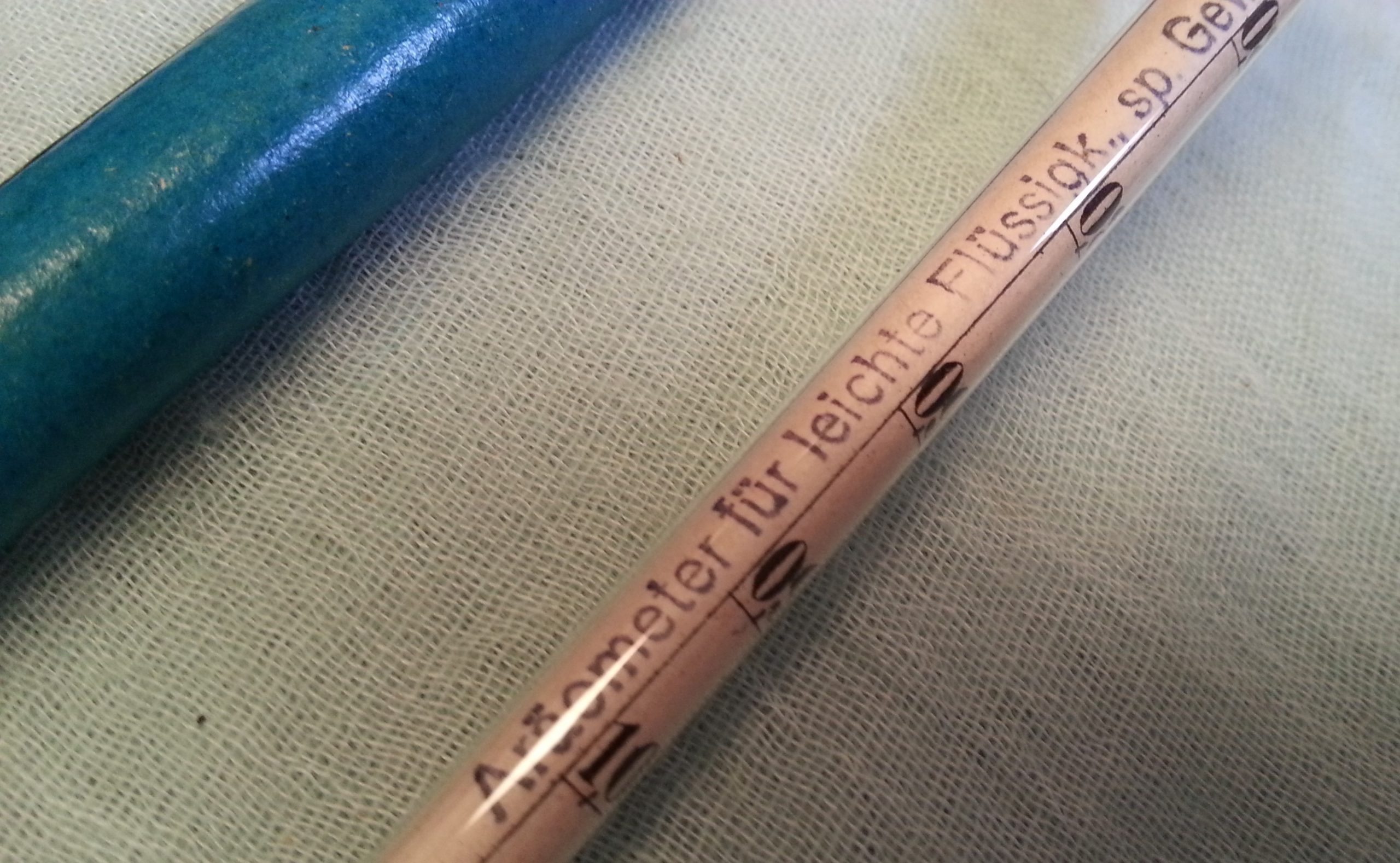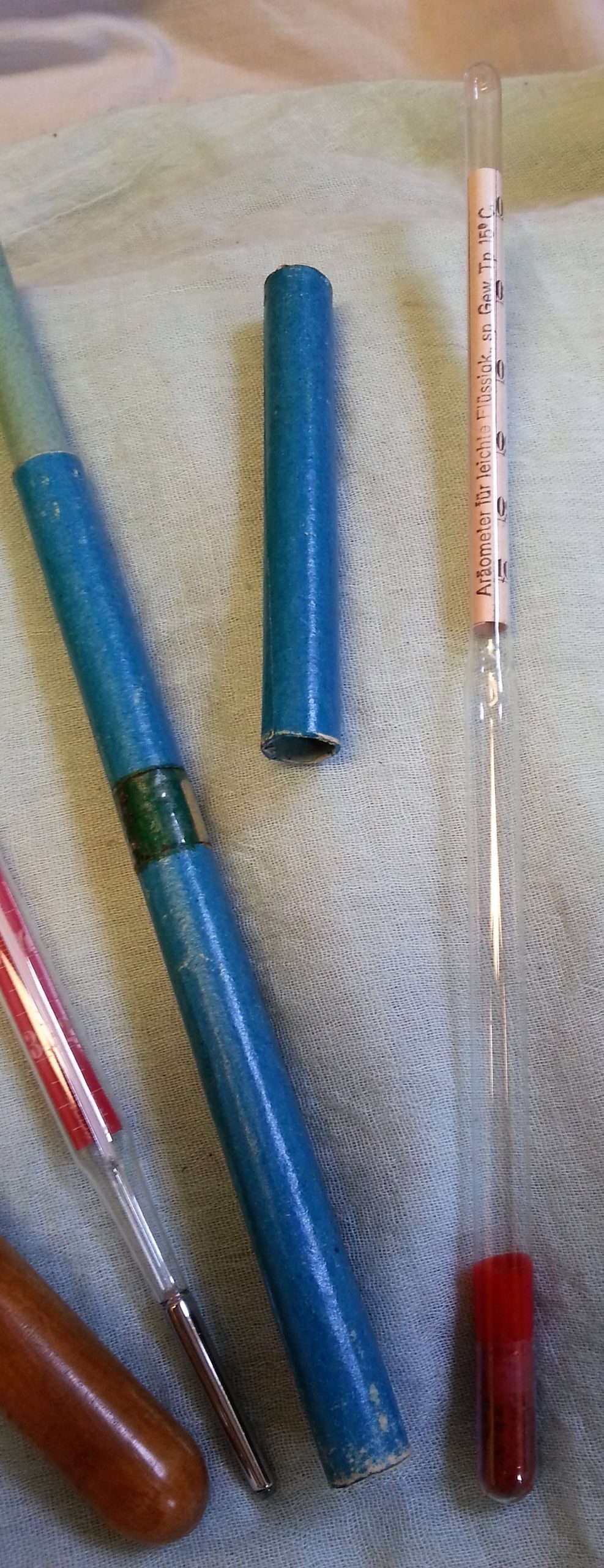 Curiosos termómetros, aerómetros muy especializados. Utilizados para medir diferentes densidades.