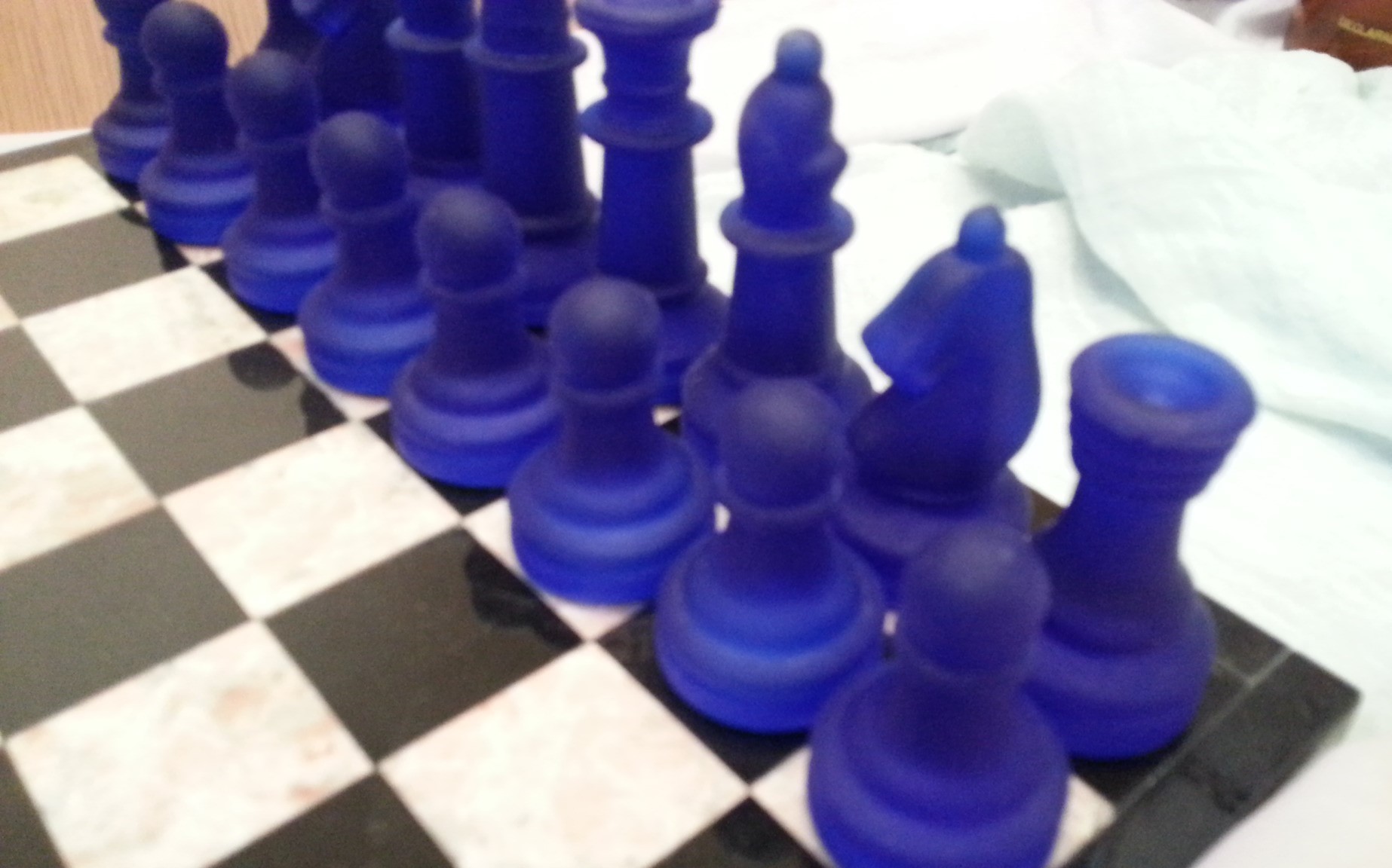 Preciosa ajedrez de los años 80 con piezas en vidrio esmerilado que miden de alto entre los 8 cm y 4,5 cm en tablero de mármol que mide 26 cm * 26 cm.