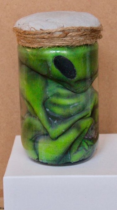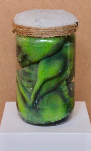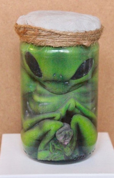 Alienígena verde muy peligroso. Réplica. Metido en tarro de vidrio con agua.