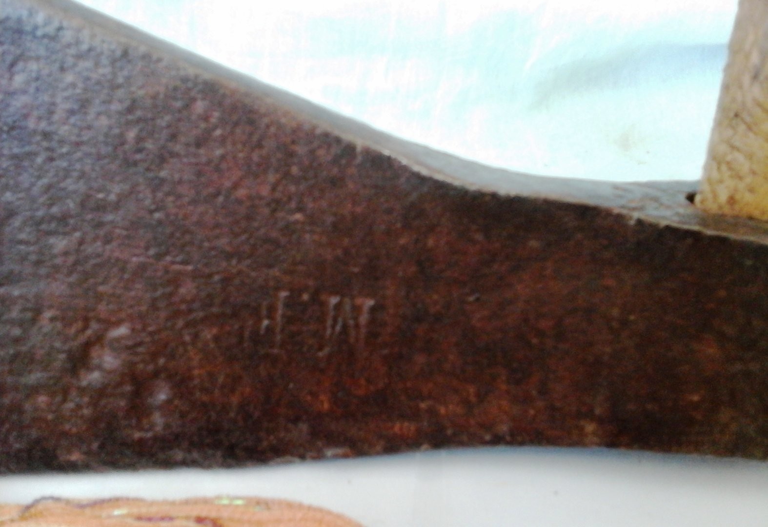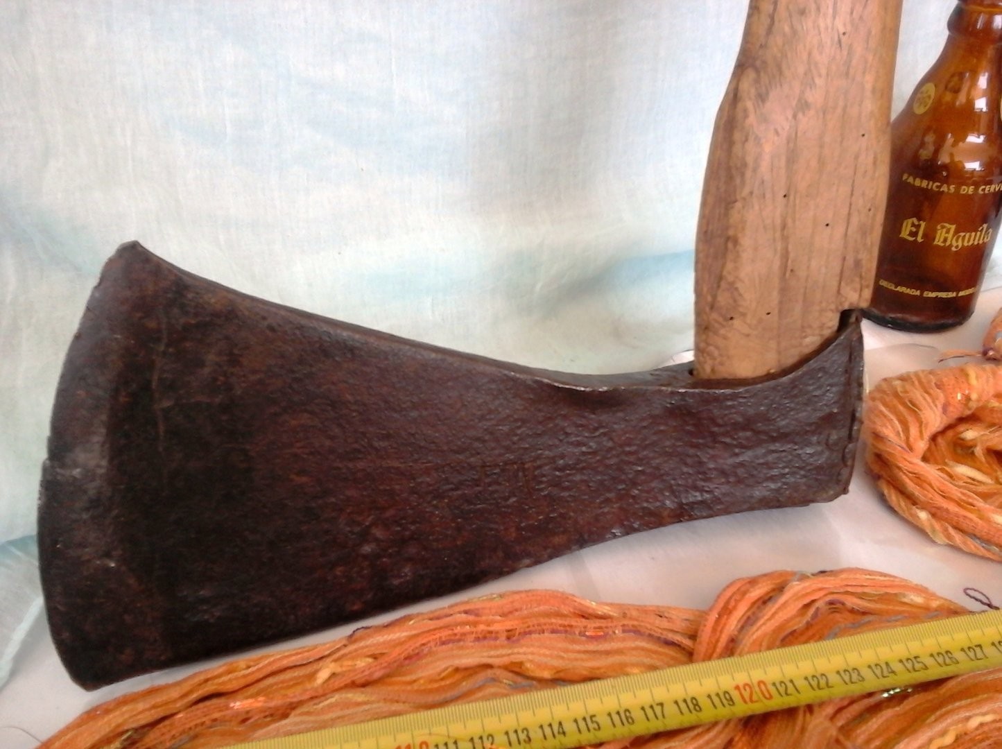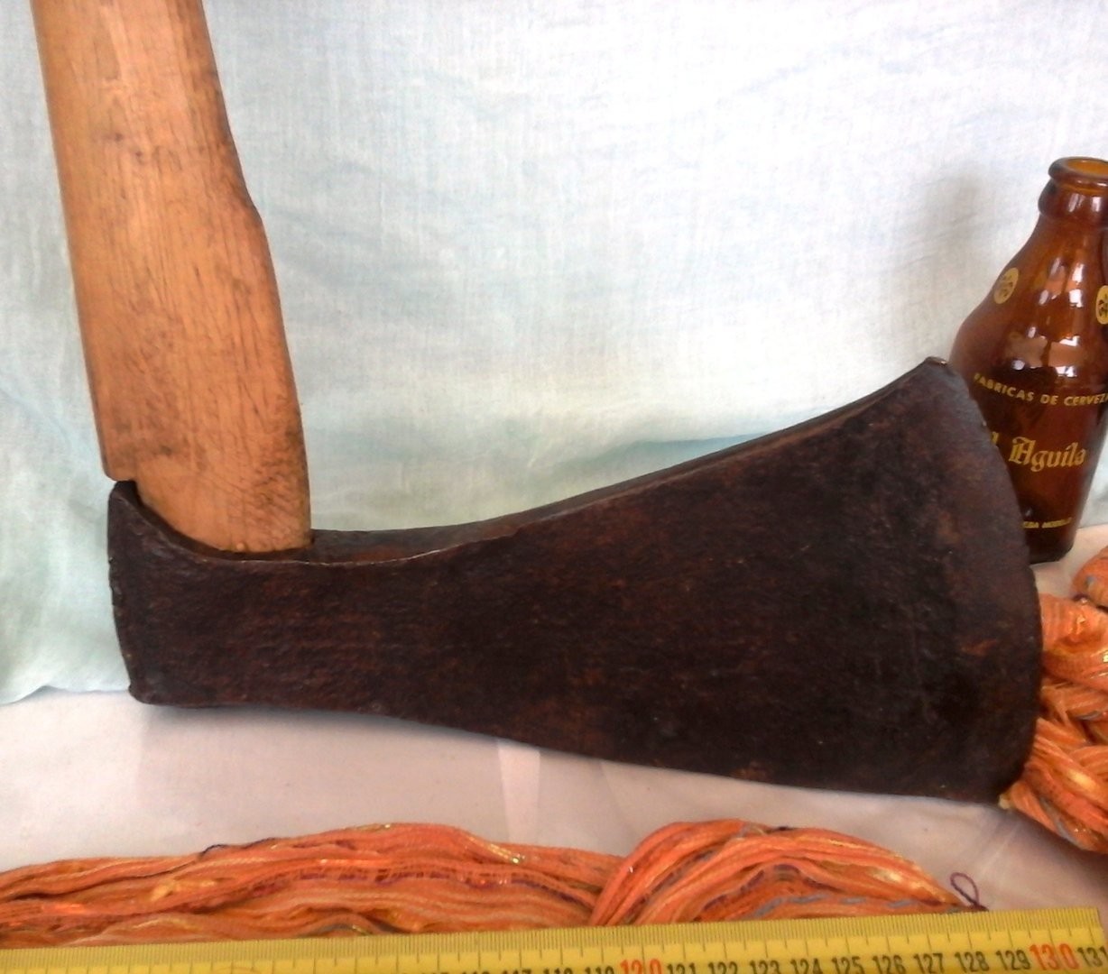 Hermosa hacha de grandes proporciones en buen estado general. Pieza muy antigua de gran calidad. Tiene grabada las inciales M. F. en su hoja.