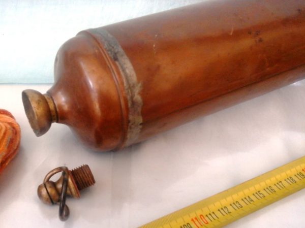 ANTIGUO CALIENTA-CAMAS. EN COBRE. FORMA CILÍNDRICA: Precioso objeto de decoración metálico y fabricado en cobre y bronce. Antiguo calientacamas o calienta pies, en cobre con tapón central de bronce. Se llenaba de agua caliente para calentar sábanas, pies, etcCon la forma cilíndrica, tipo botella alargadaSólida y pesada. No hay daños, ni óxido. Sin abolladuras apreciablesMide 32 cms de alto por 9 cms de diámetro Ref. nº 960
