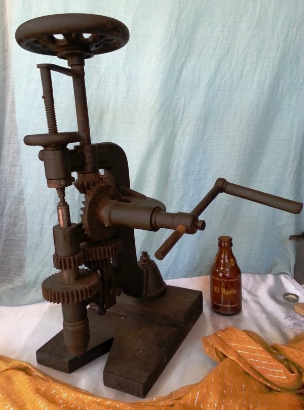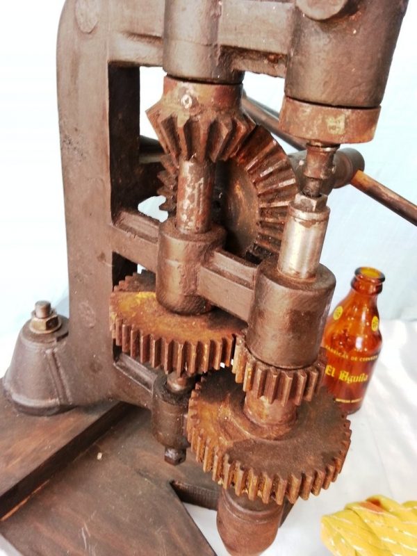ANTIGUO TALADRO MANUAL VERTICAL DE BANCO. AÑOS 1940. OLD MANUAL VERTICAL DRILL: Es una pieza muy especial y muy valorada por los talleres de principios del siglo XX ya que es totalmente manual y con sus mecanismos de dobles engranajes conseguía taladrar cualquier material con poco esfuerzo gracias a su volante de inercia superior de gran tamaño. Se nota el tiempo pasado. Signos de vejez acumulada pero una bonita pieza de colección necesita mucha limpieza y engrase si se quiere que sus engranajes funcionen… Mide 51 cm de alto * 30 cm de ancho y con una profundidad de 20 cm. Ref. Parc. nº 187