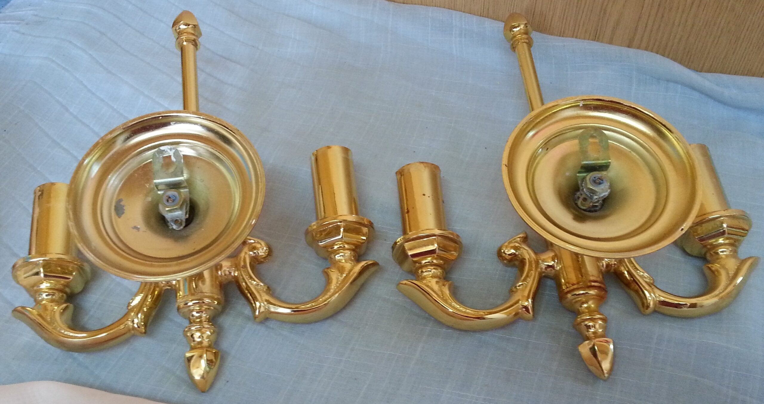 Se trata de viejos apliques eléctricos que se han reutilizado como candelabros. En el lote van incluidas las velas que aparecen en las fotografías.