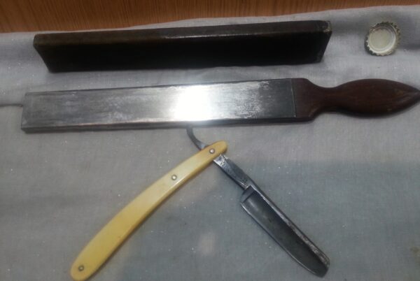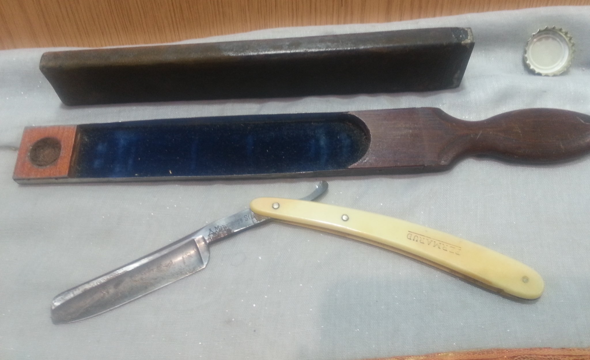 Colección de utensilios antiguos de barbero. Asentador y navaja de barbero.