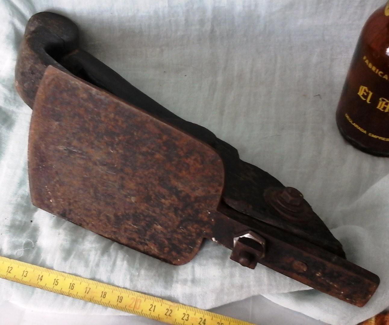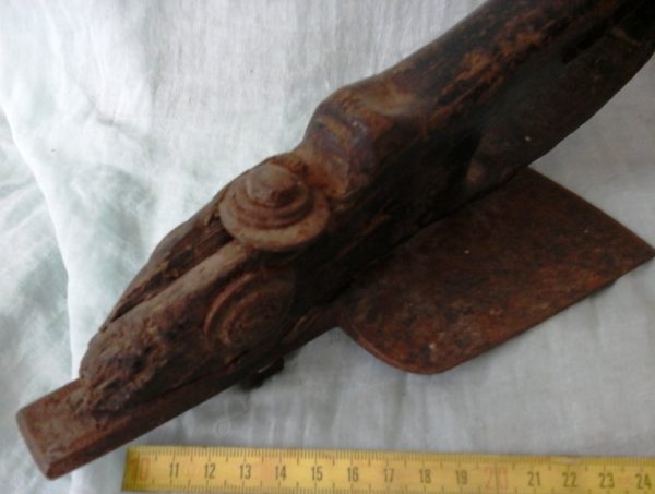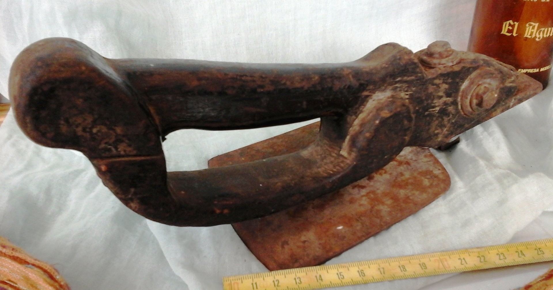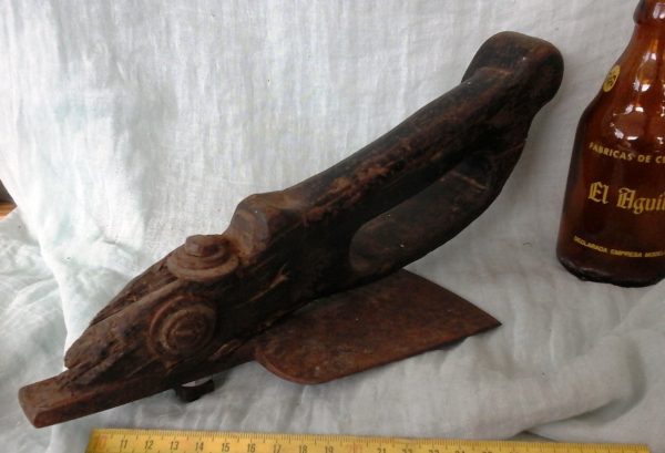 AZUELA ANTIGUA DE EBANISTA CARPINTERO. AZUELA OLD CARPENTER: Utilizada antiguamente para debastar los tablones de noble madera (abedul, haya… ) con los que se construían toneles, barricas o para dar forma a traviesas en la construcción. Está claro que tiene evidente síntomas de desgaste del tiempo trabajado. Conserva marcas grabadas en su hierro del herrador. Mide 30 cm de larga * 12 cm de alta y su hoja 10,5 cm de ancho. Ref. AZUELA nº 15