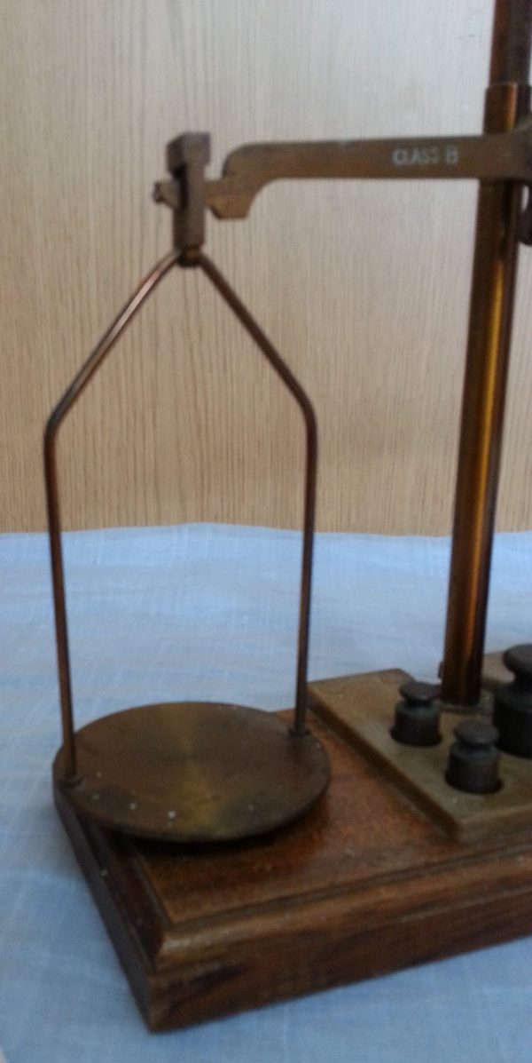 Preciosa y útil balanza con juego de pesas en bronce completo. Base de madera y mástil en bronce con platillos en cobre.