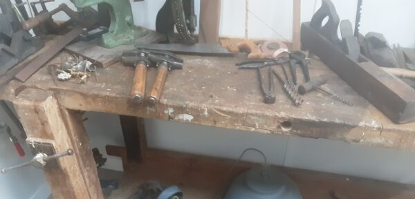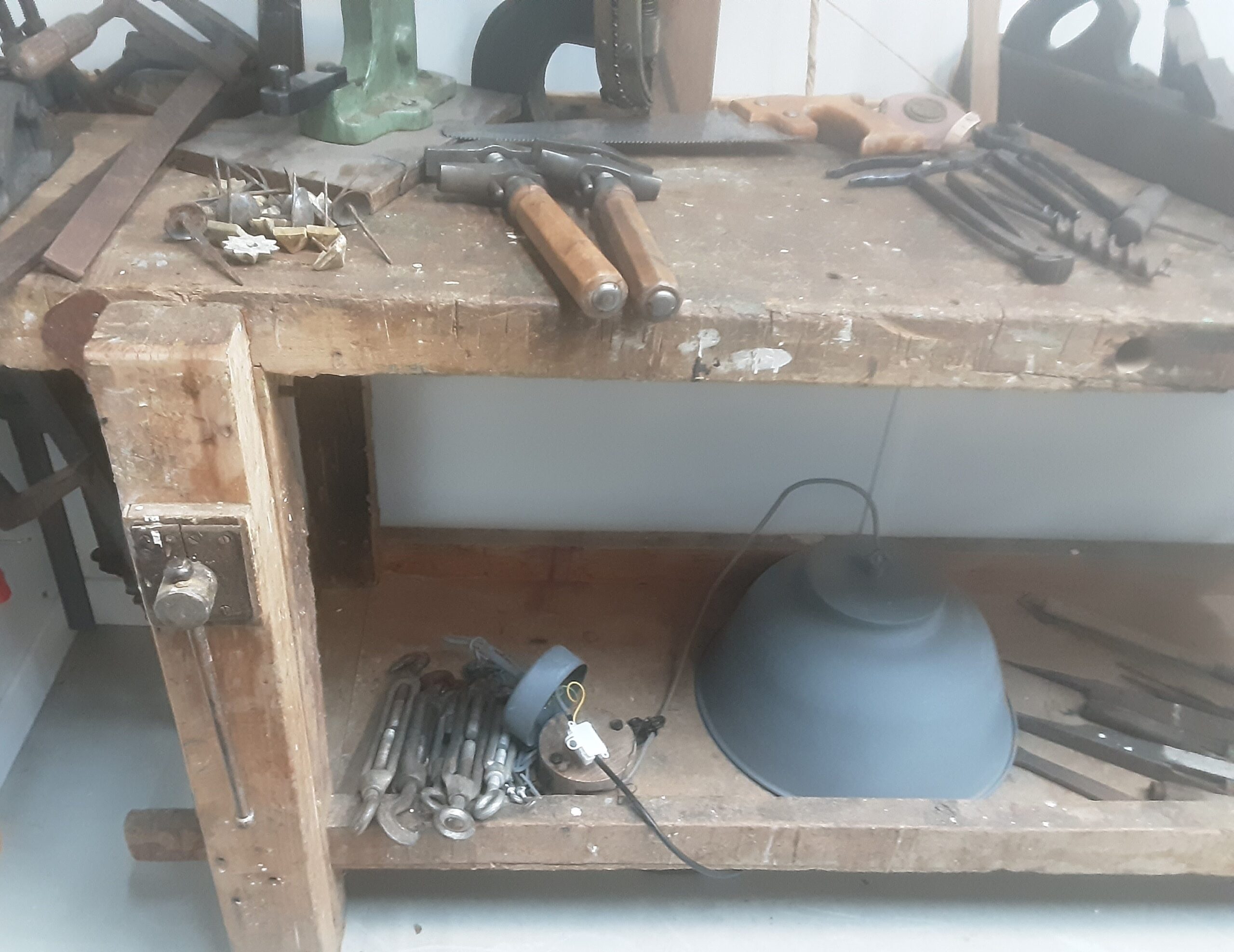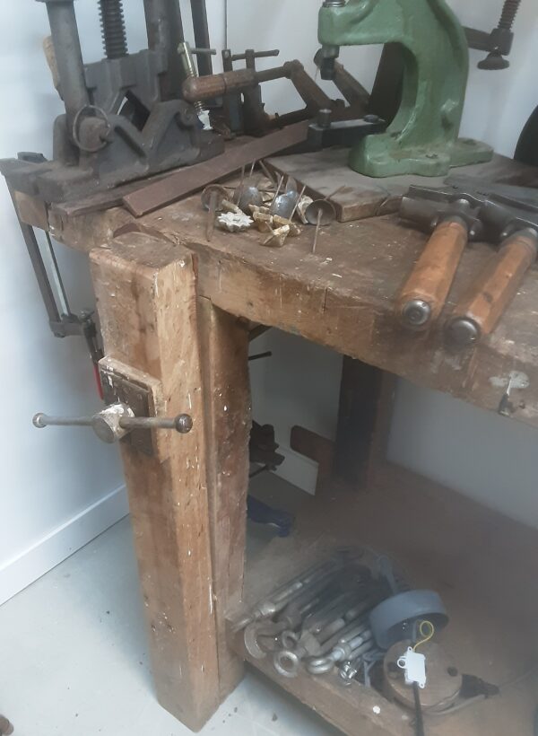Gran banco de trabajo de carpintero rescatado de viejo taller de ebanistería de los años 70-80