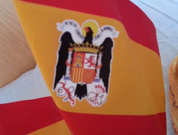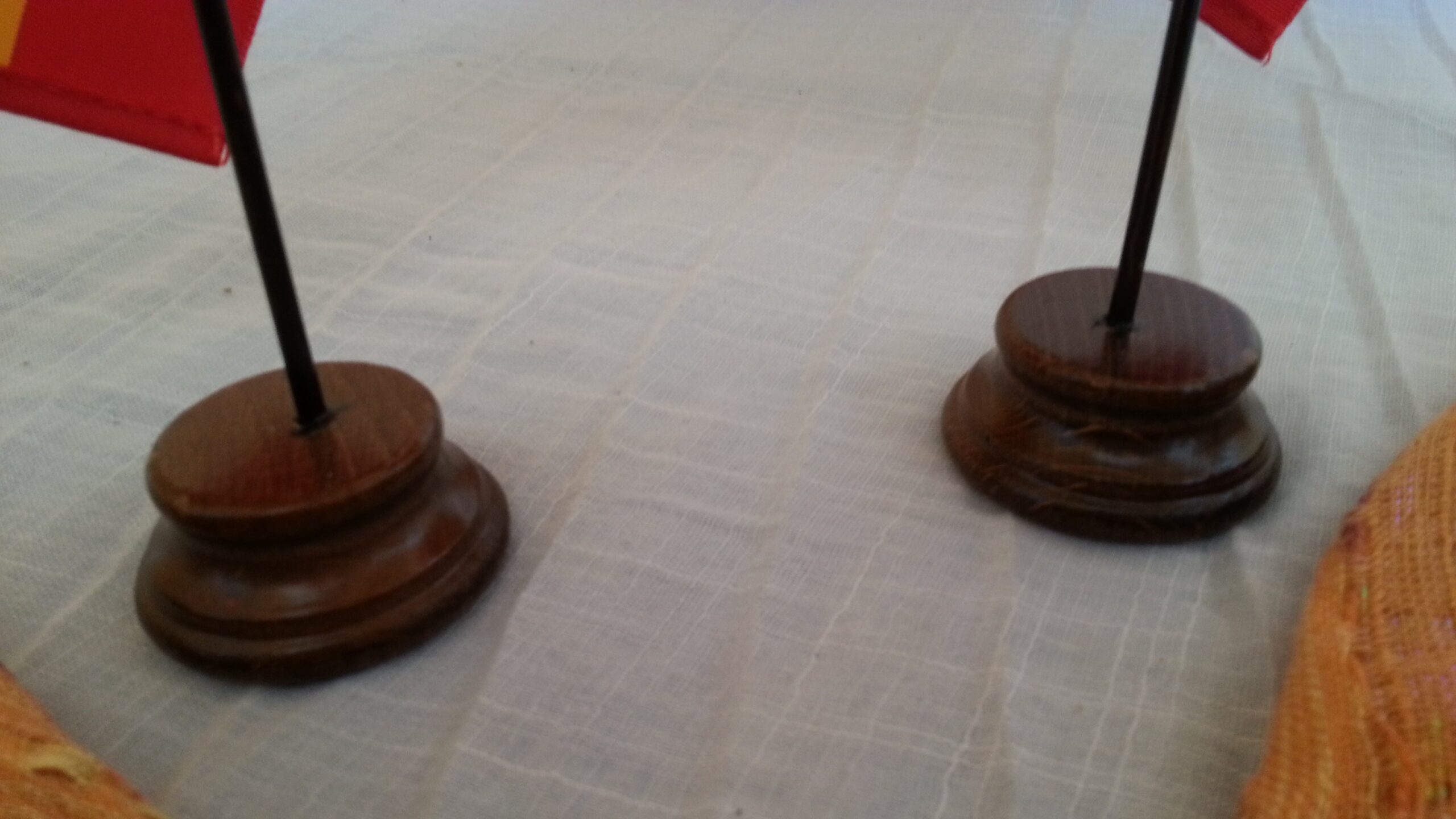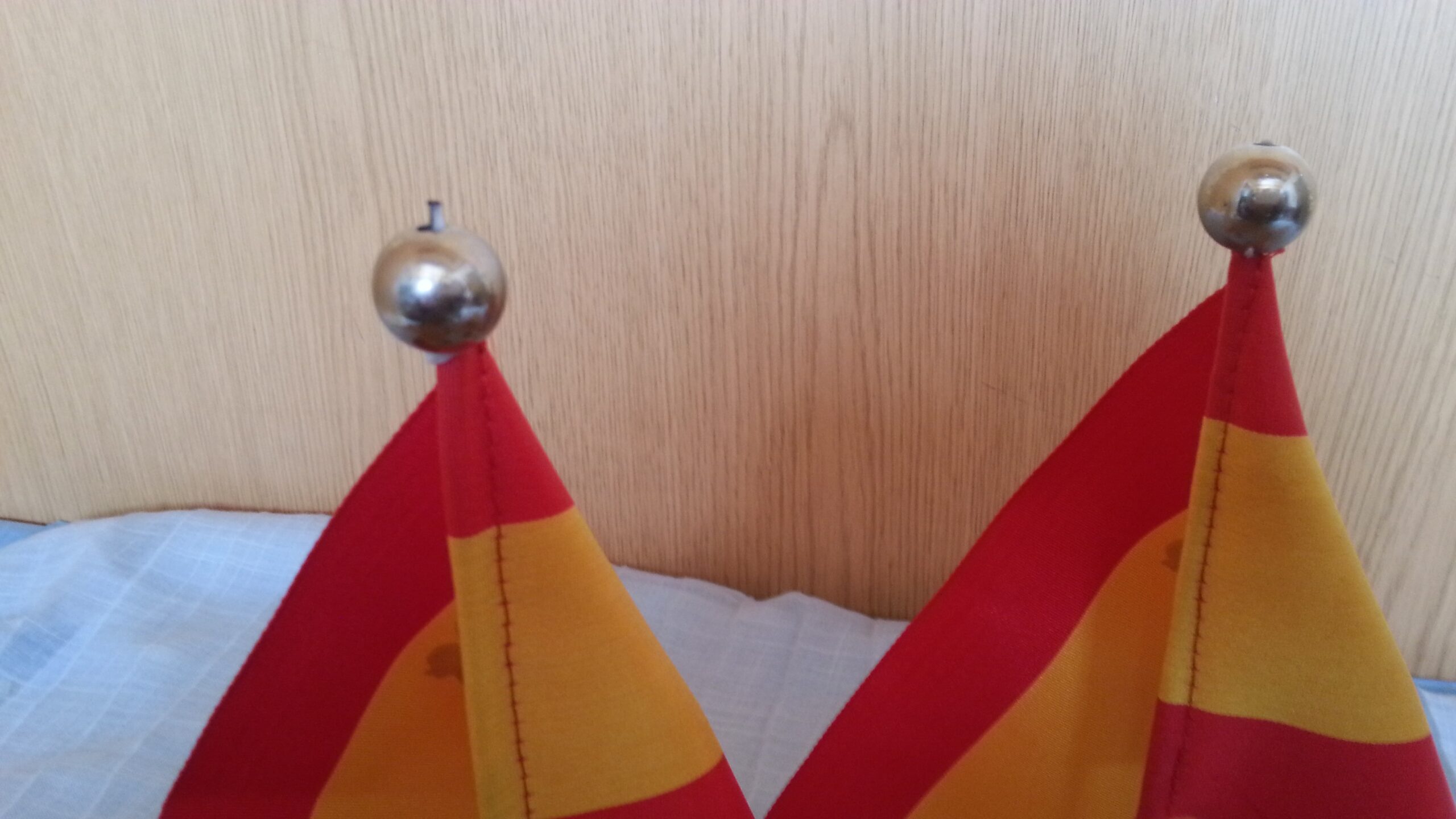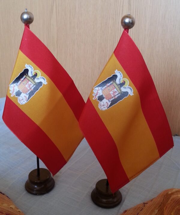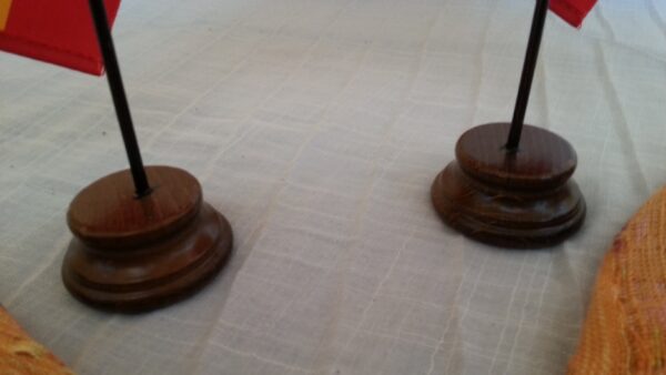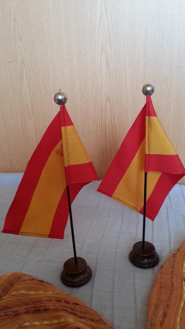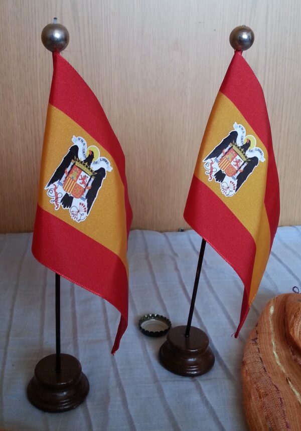 Pareja de banderitas franquistas con peana de madera y escudo franquista serigrafiado. Están nuevas. A estrenar.