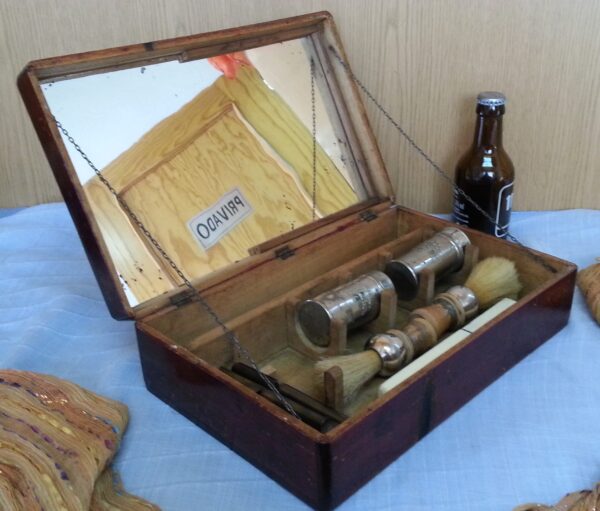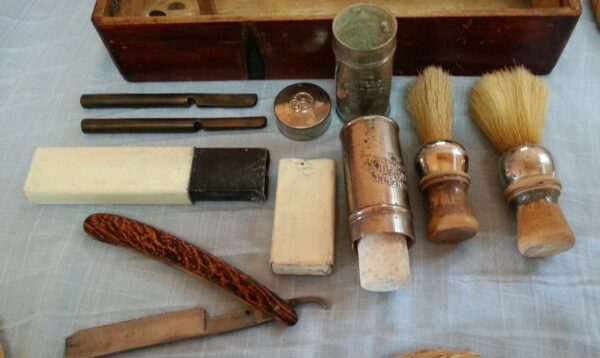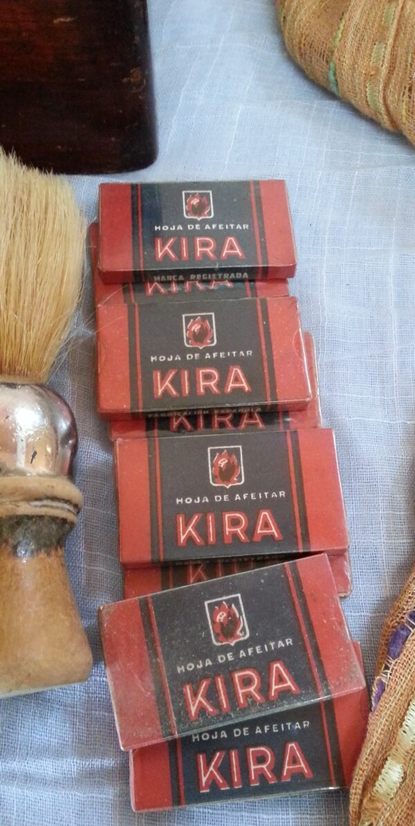Conjunto de antiguos utensilios de barbero compuesto por: 2 jaboneras barba, 1 navaja de afeitar marca Solingen con funda, 2 brochas, 2 soportes cuchillas de afeitar y 8 paquetes de hojas de afeitar marca Kira.