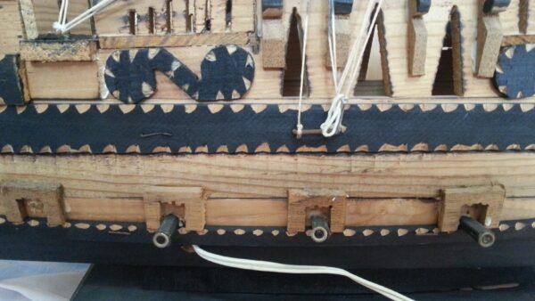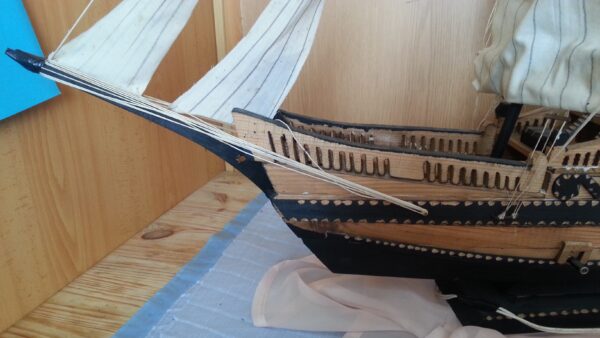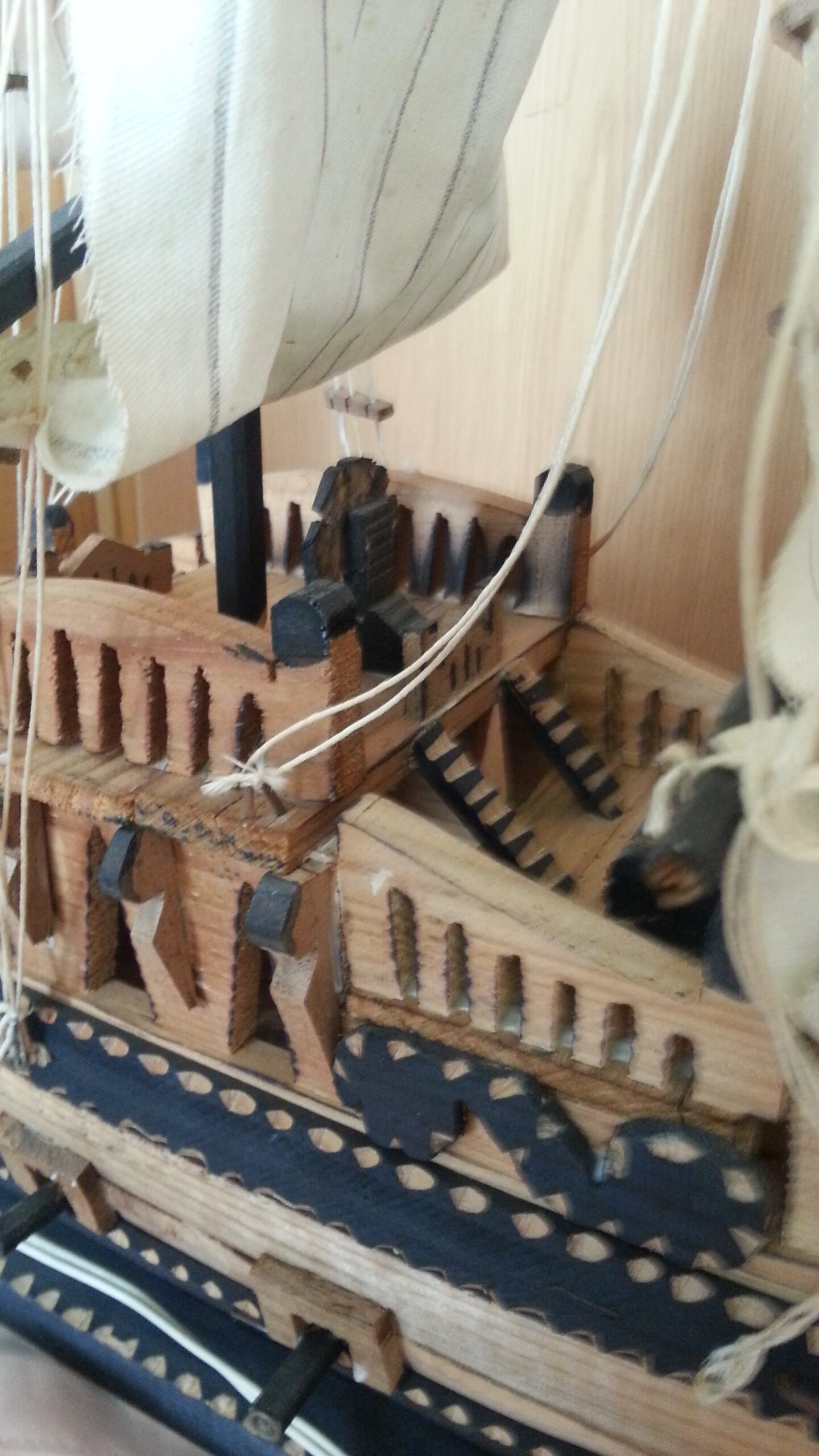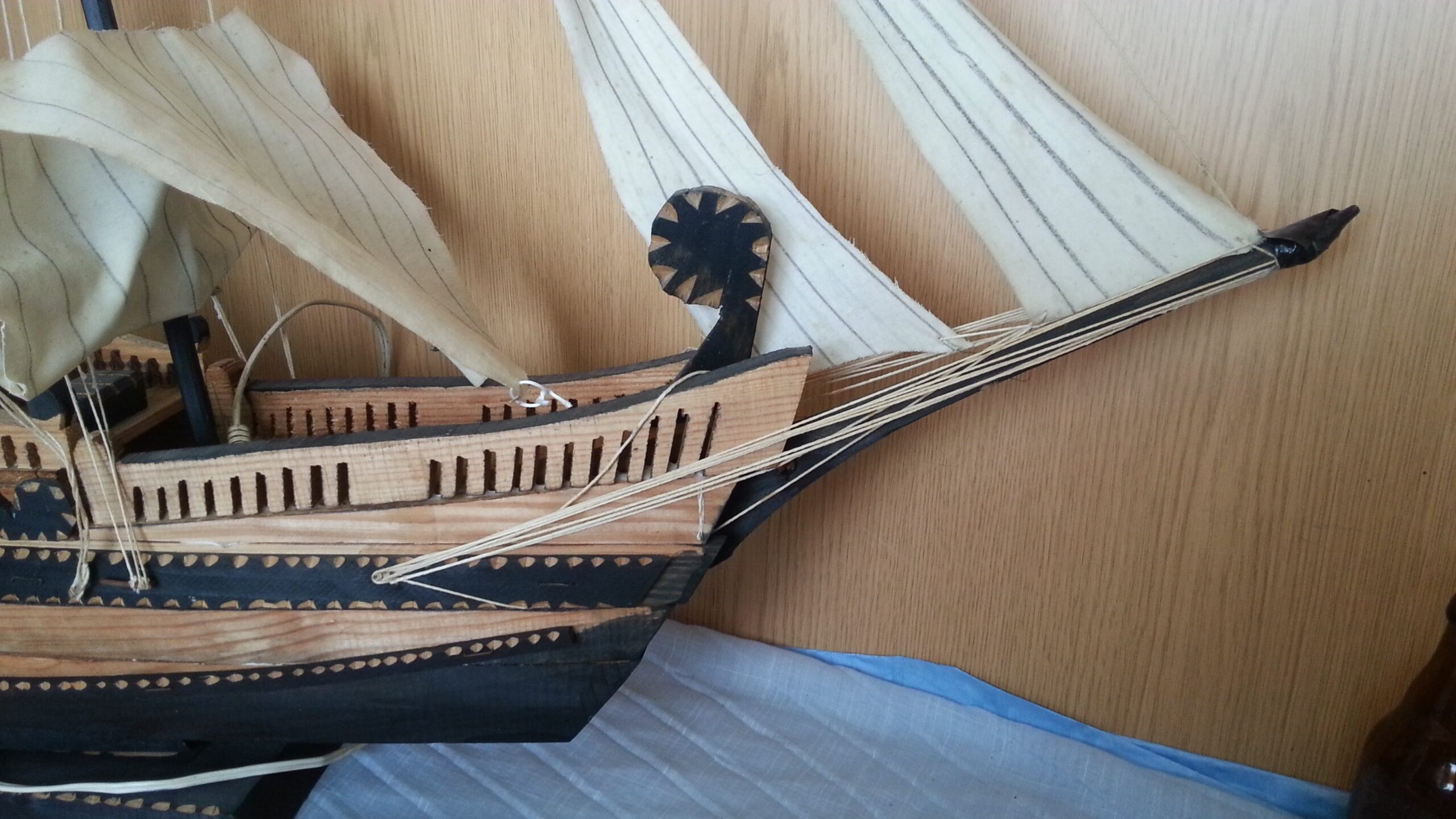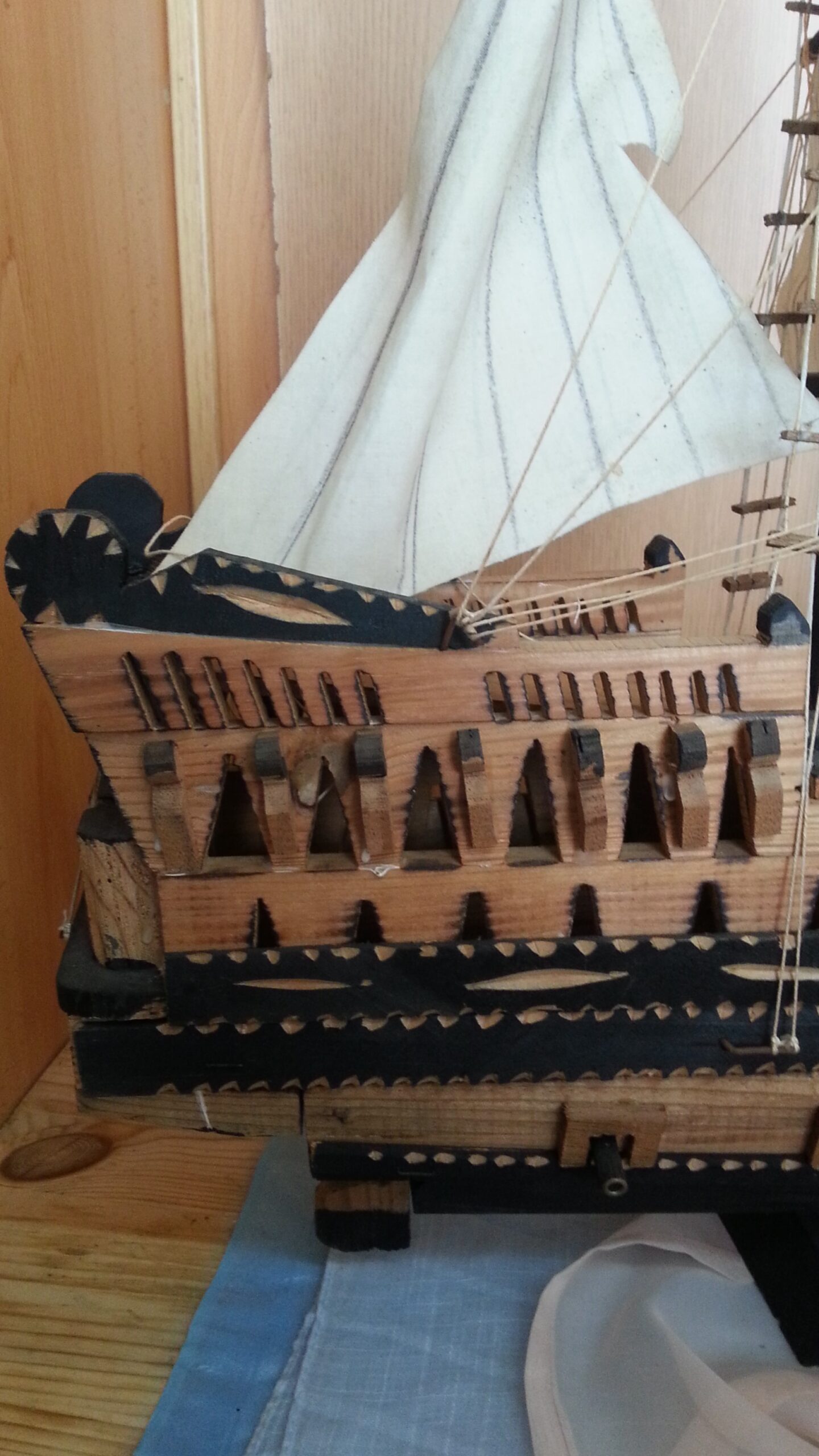 Preciosa maqueta de barco galeón. Construido artesanalmente tiene una decoración muy especial con múltiples detalles. Le falta un cañón y presenta algunos signos de la edad. Está preparado para poder iluminar su interior.