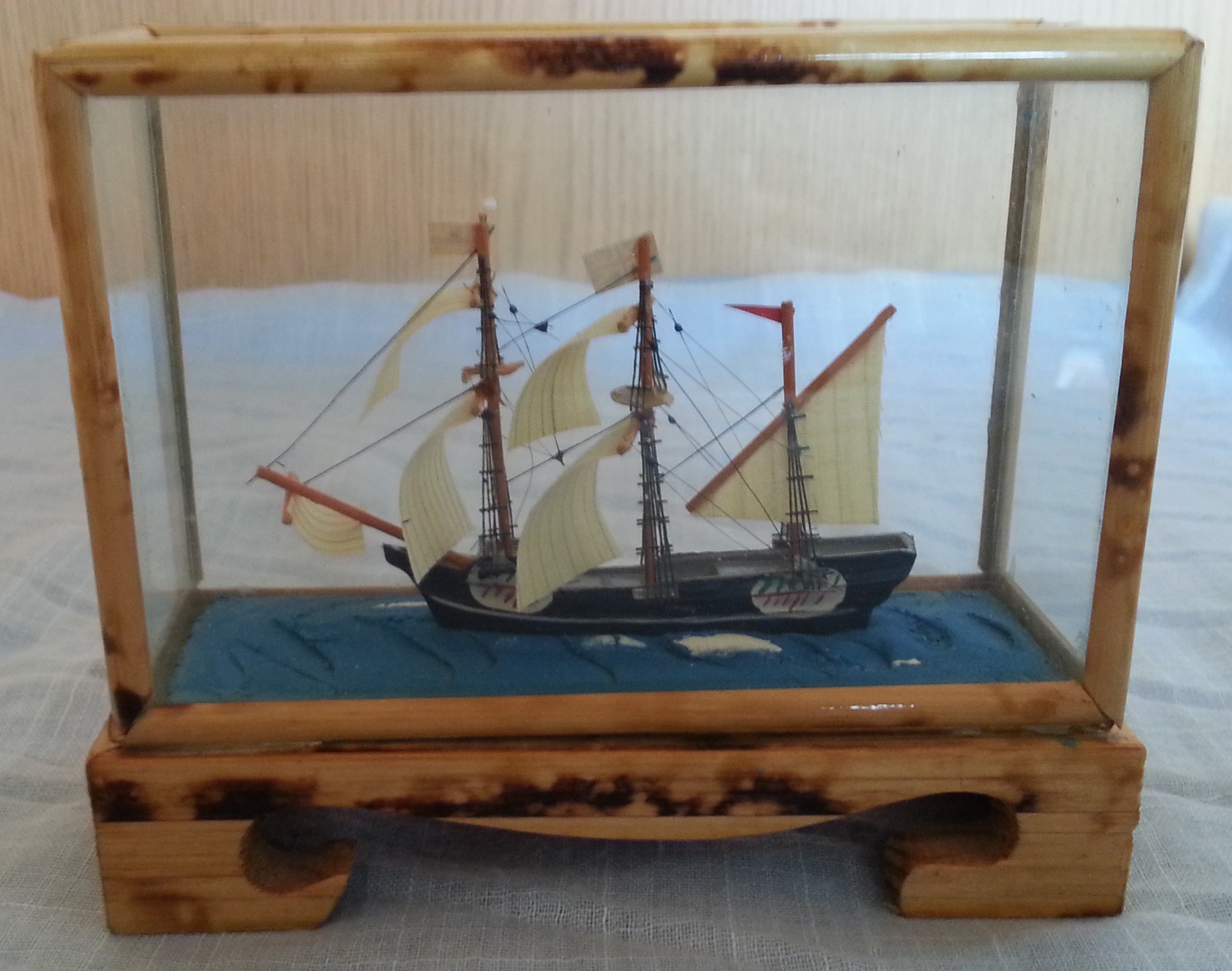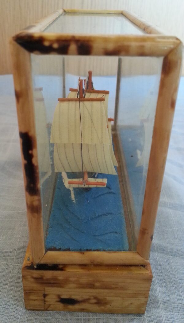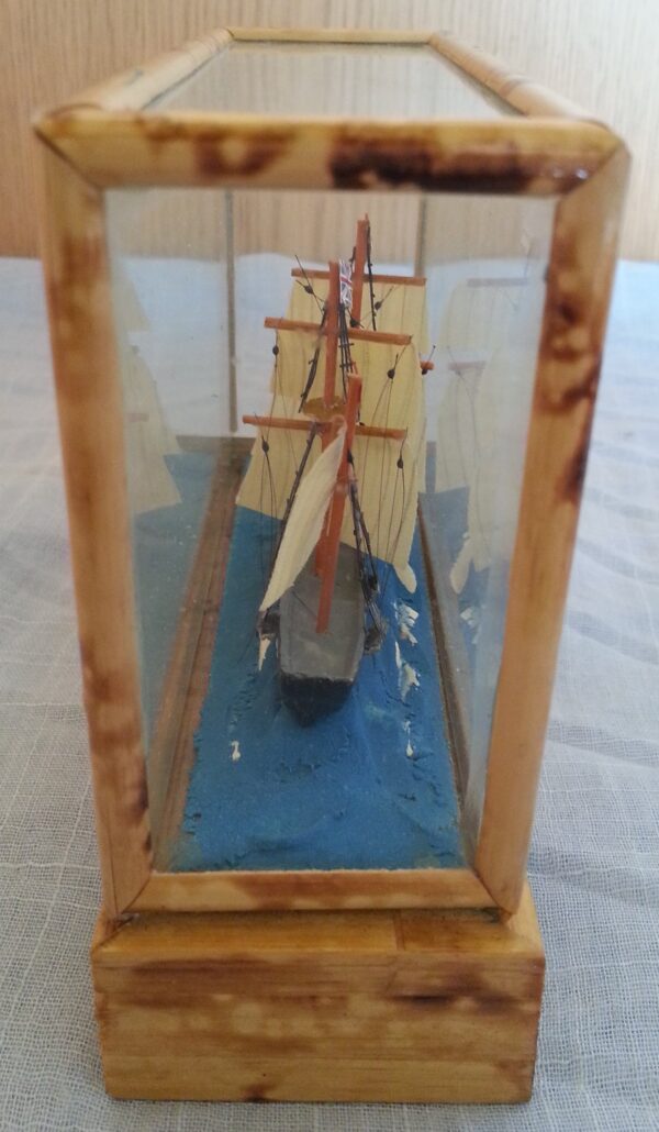 Es un precioso barco velero introducido en vitrina acristalada con bastidor de madera.