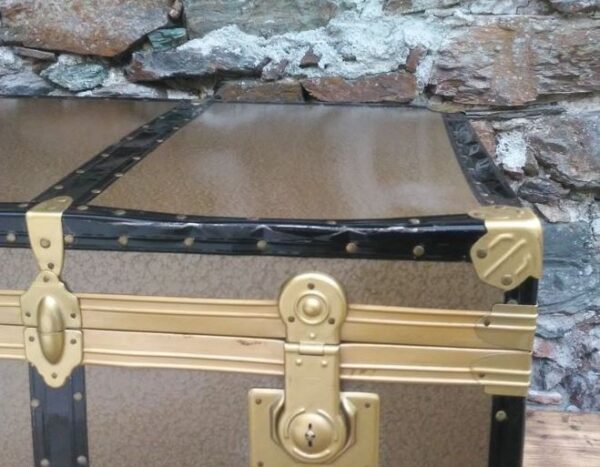 Baúl de grandes dimensiones en buen estado, tanto por dentro como por fuera. Muestra signos normales de desgaste y envejecimiento. En el interior, está forrado con un papel florentino vintage.