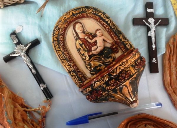 Benditera viejita en resina + 2 crucifijos pequeñitos