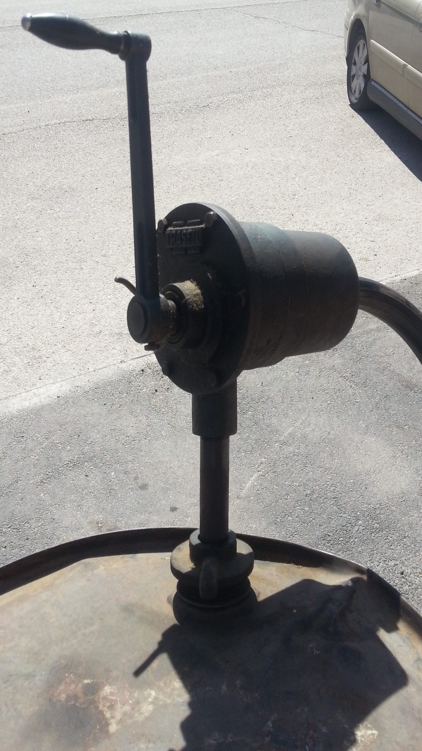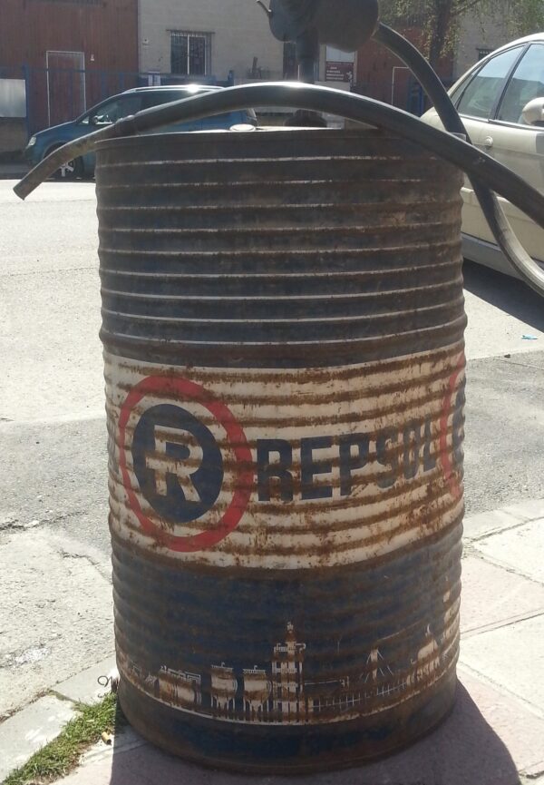 Además de emblemático, este bidón en chapa con el logotipo de REPSOL para decorar espacios estilo vintage o antiguo, incorpora una bomba de gasoil introducida por su boca para sacar el combustible que contenía.