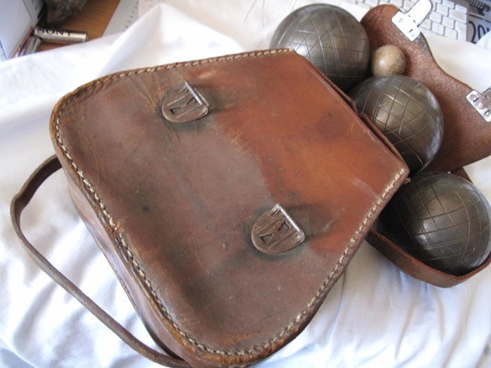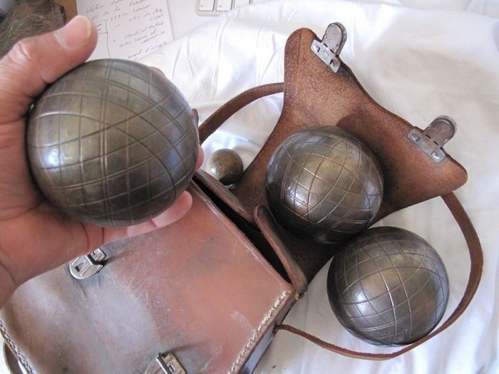 Años 50 Emblemático conjunto de 3 bolas metálicas, bola pequeña de madera y con su bolsa de cuero original para guardar el juego.