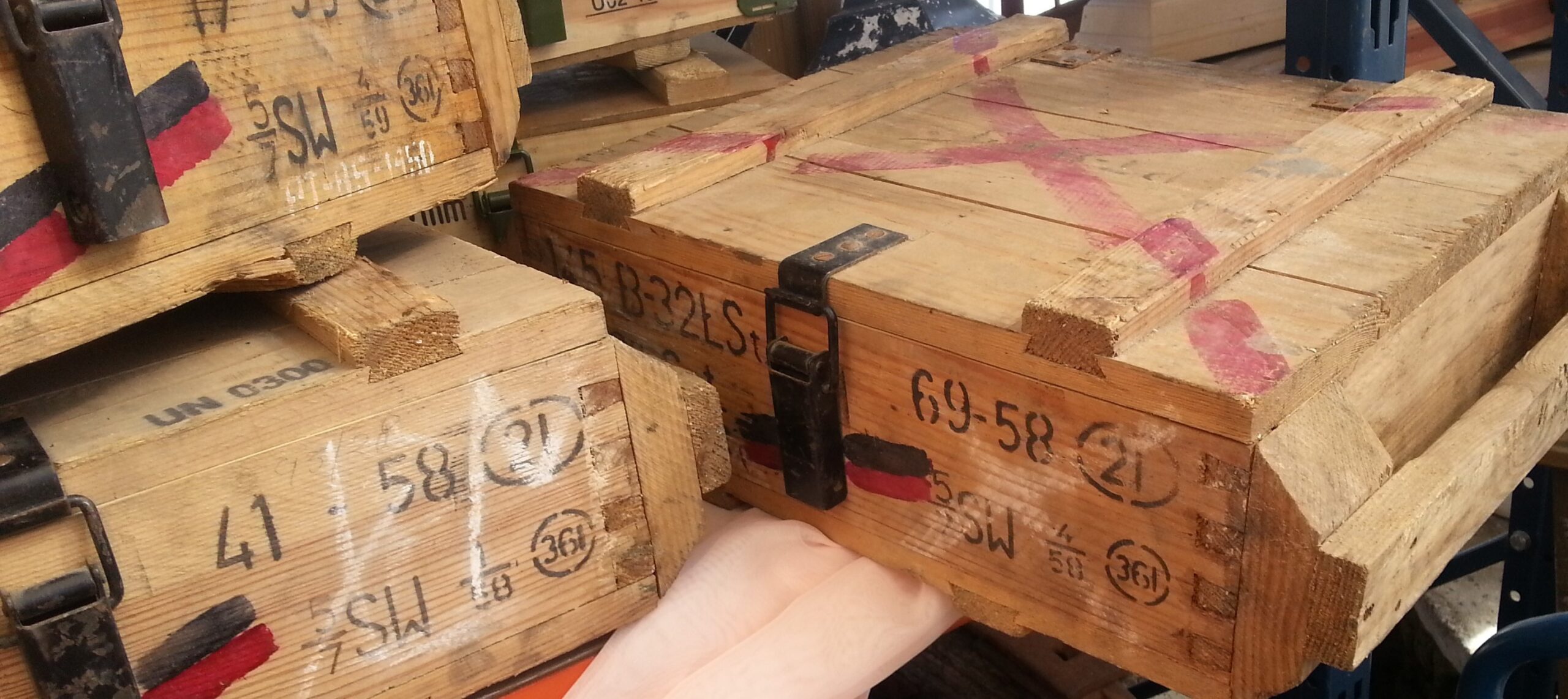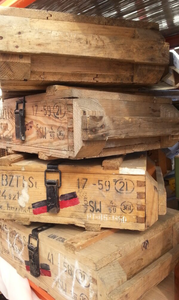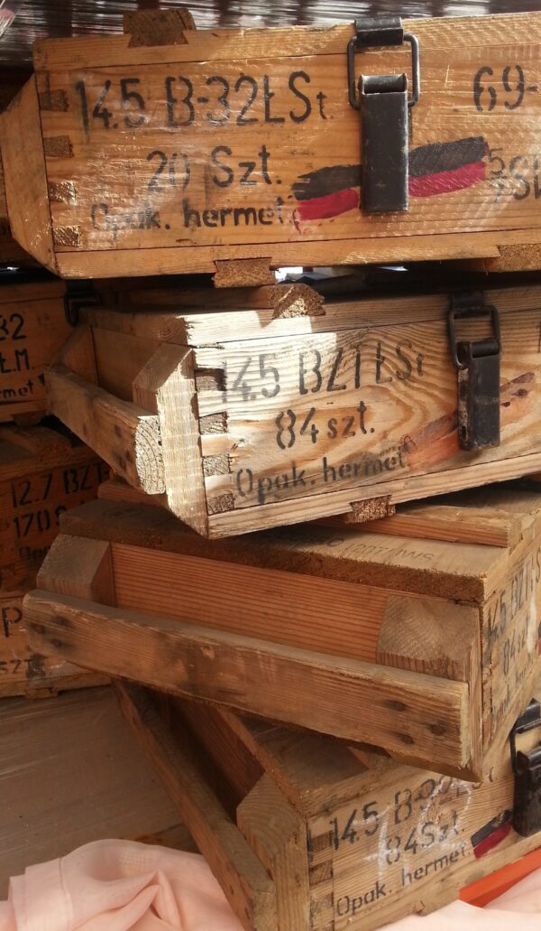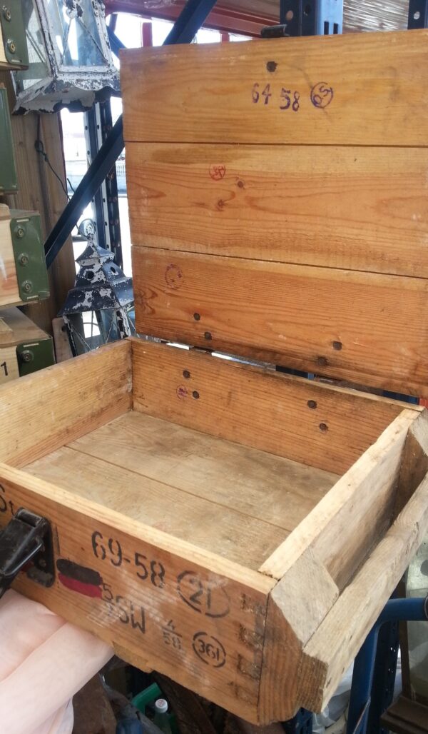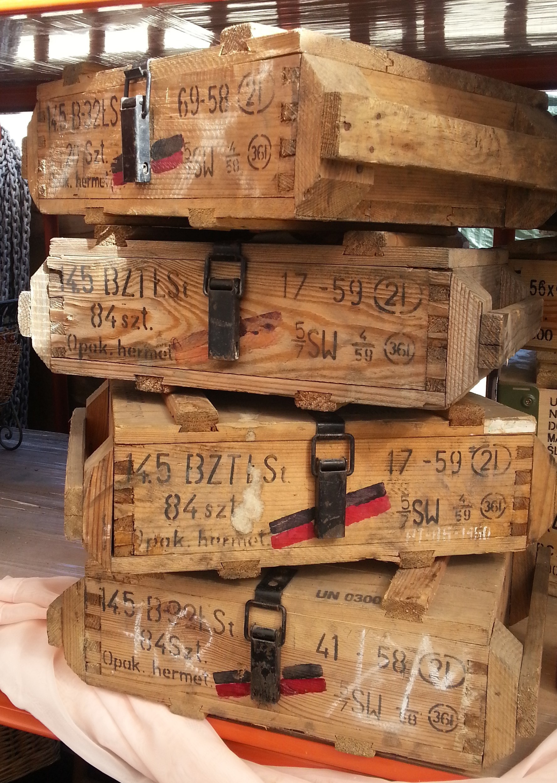 Viejas cajas de madera para atrezzar y decorar. Emblemáticas cajas militares de los años 60-70