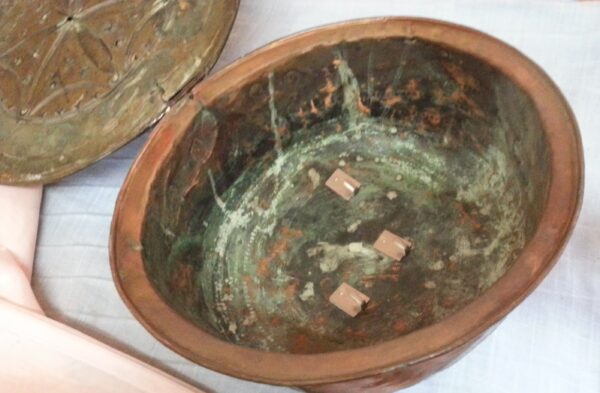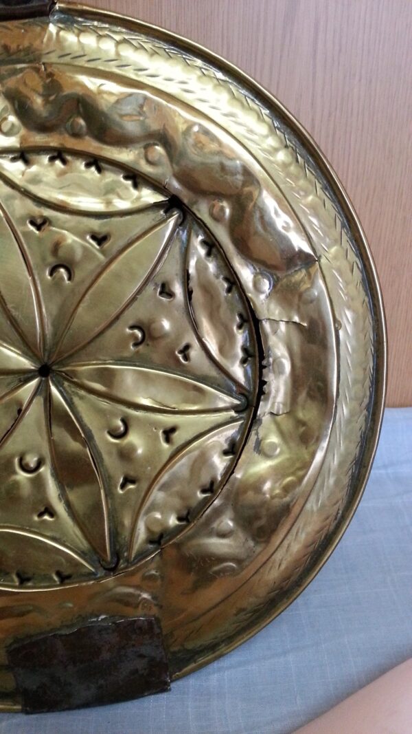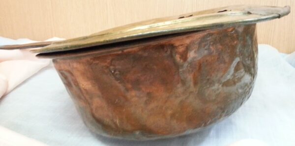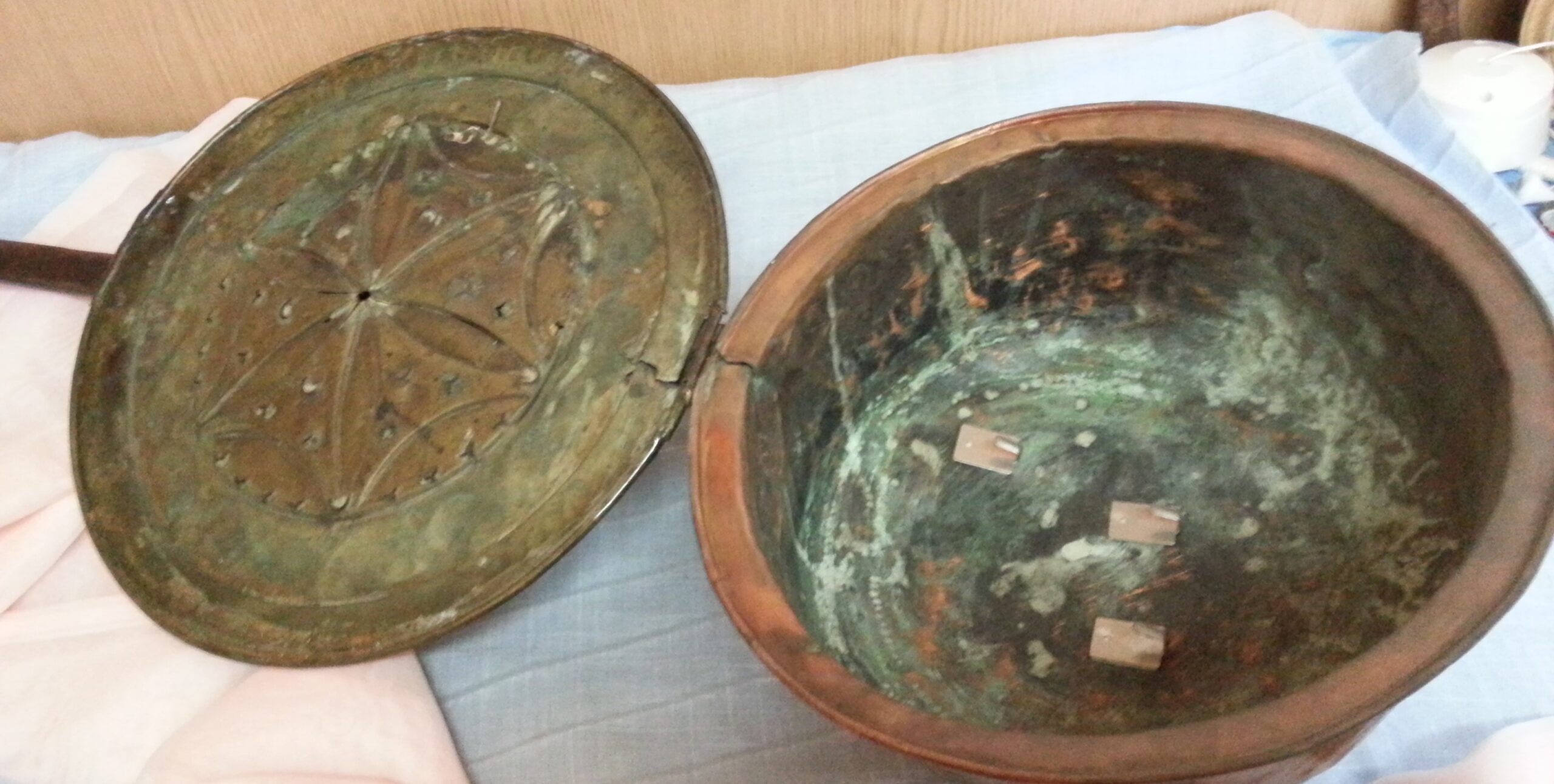 Este centenario Calienta camas en cobre tiene algunos desperfectos debido a los años pasados. Solo lo ofrecemos como objeto de atrezzo o decoración.