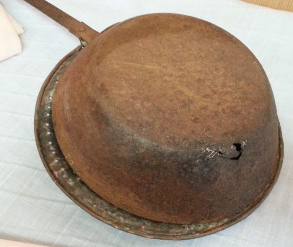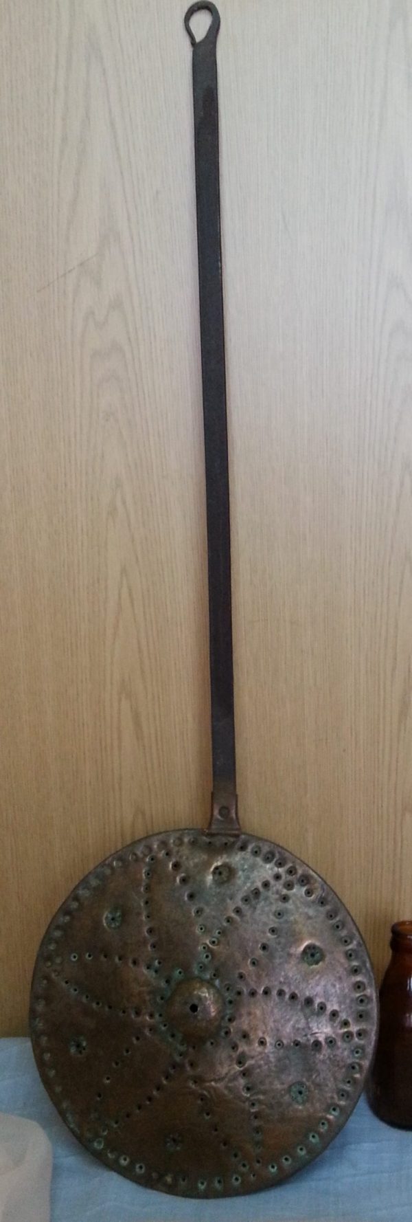 Este centenario Calienta camas en cobre tiene algunos desperfectos debido a los años pasados. Solo lo ofrecemos como objeto de atrezzo o decoración.