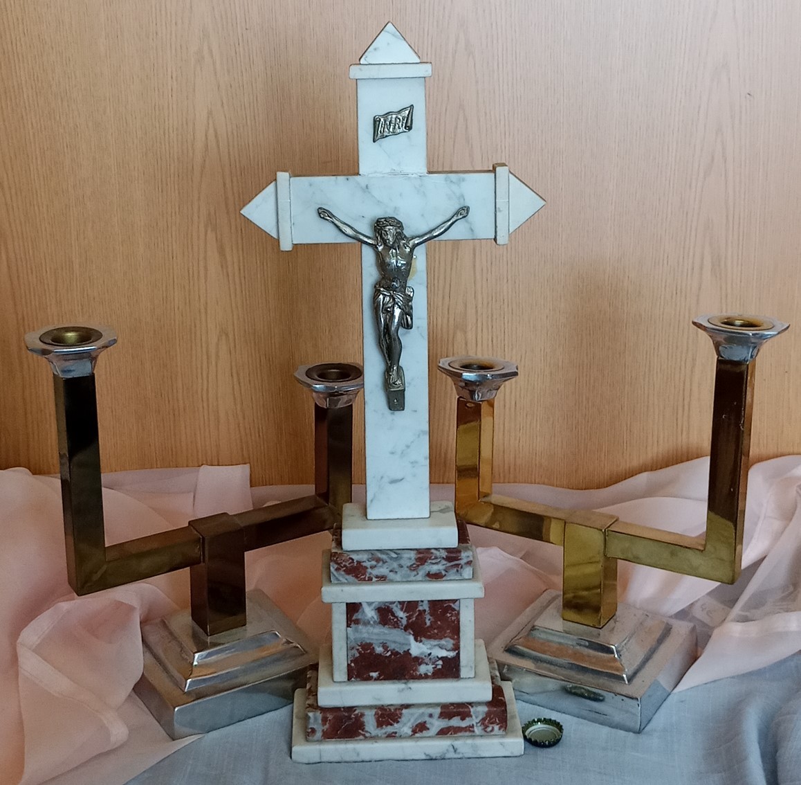 Precioso y antiguo conjunto de calvario y dos candelabros de origen belga.
