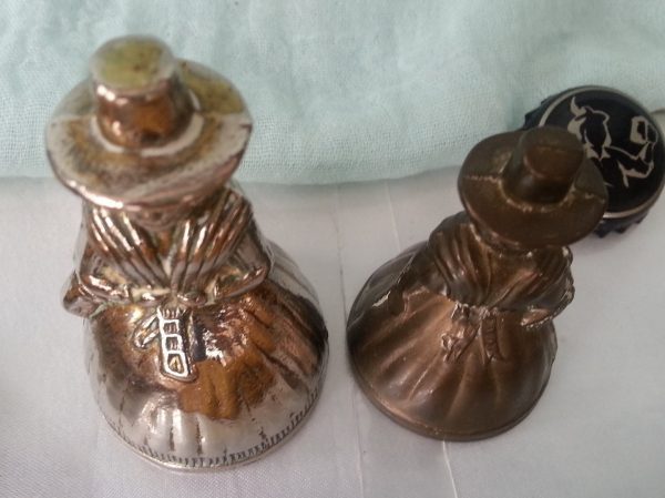 PAREJA DE CAMPANILLAS. FORMA DE SEÑORITAS. EN LATÓN: Bien conservadas etas dos campanillas. Falta el badajo a la pequeñita. Miden respectivamente 7 cm de alto * 4 cm de diámetro y 5 cm de altura * 3,5 cm de diámetro. Ref. nº 3043-A