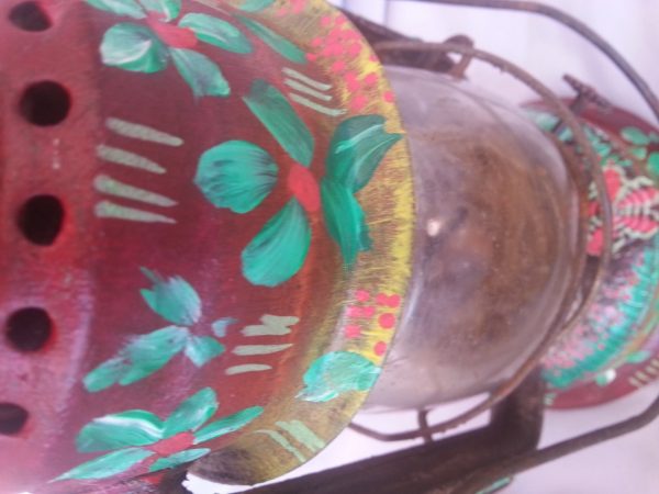 CANDIL ANTIGUO PINTADO A MANO. RÚSTICO Y EMBLEMÁTICO OBJETO DE DECORACIÓN: Sobre un antiguo candil de metal y vidrio se ha pintado a mano una bonita de decoración para darle una vida más a este útil accesorio para su terraza o jardín. Mide 26 cm de alto * 15cm de ancho. Ref. Candil nº 108