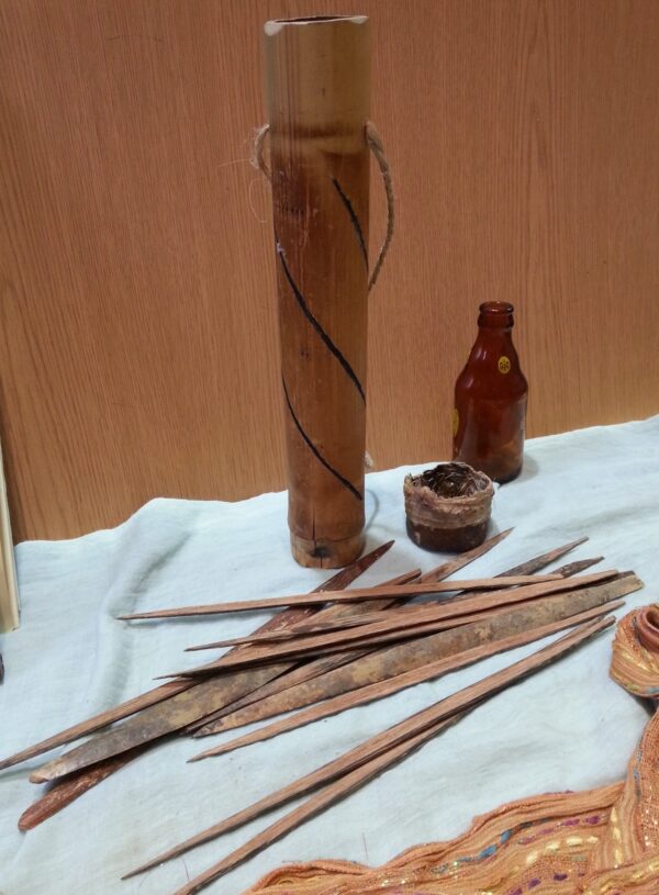 Dardos antiguos artesanales con su carcaj para guardarlos y llevarlos al hombre.