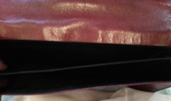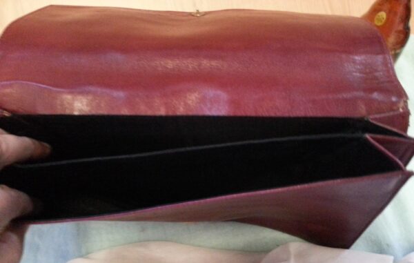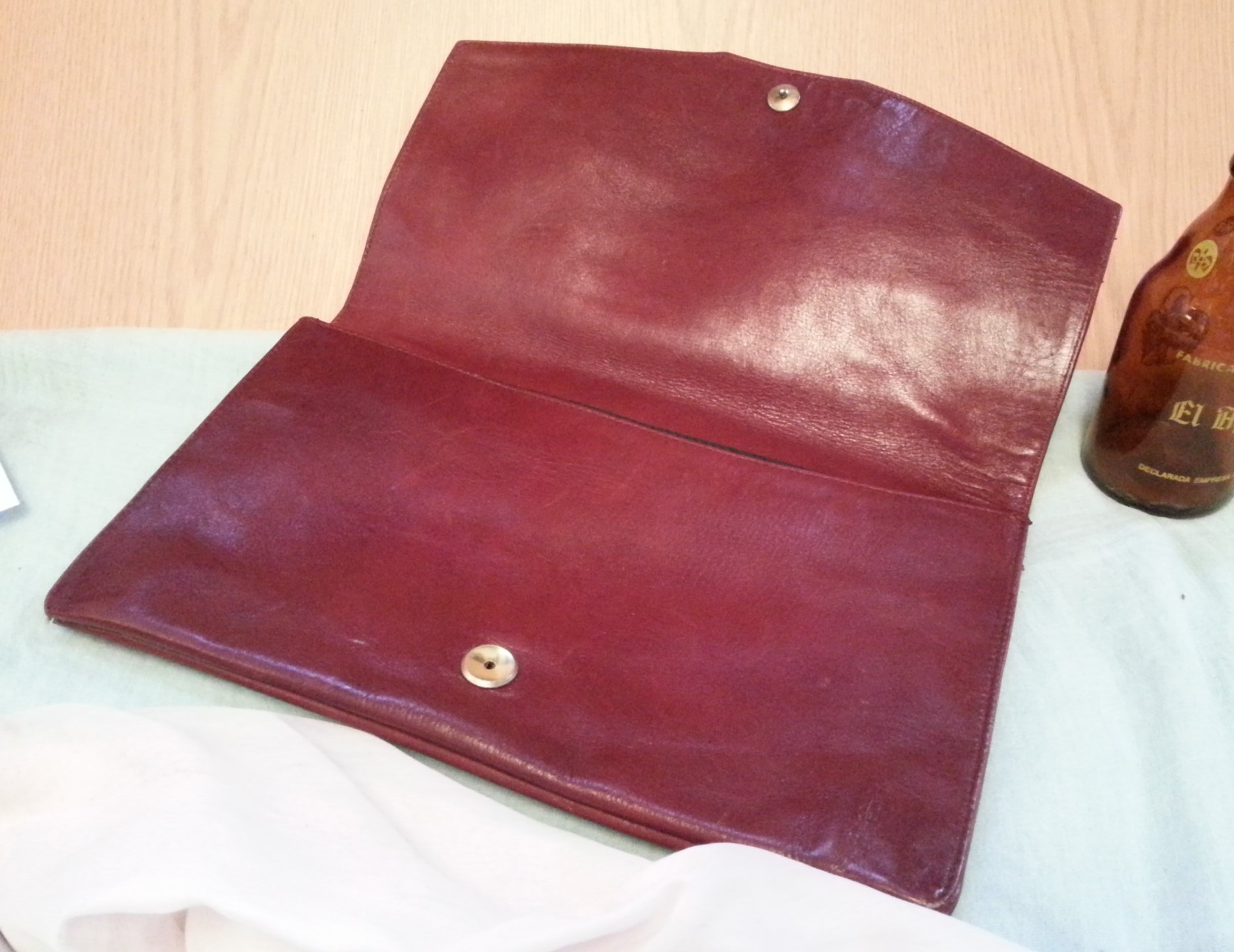 En piel o poli-piel. Mide 30 cm de ancho * 18 cm de alto.
