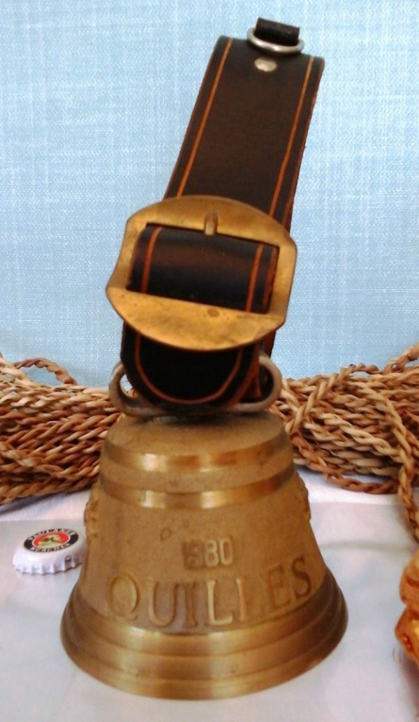 Muy bien conservada y con su decorativo collar de cuero. Su badajo funciona perfectamente. Grabado su contorno. Suena estupendamente.
