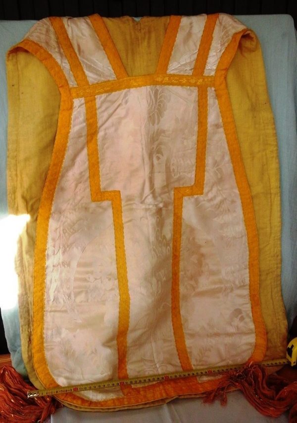 Es una preciosa y antigua casulla pero tiene rozados y desgastados por el tiempo que estuvo abandonada y por el uso también.