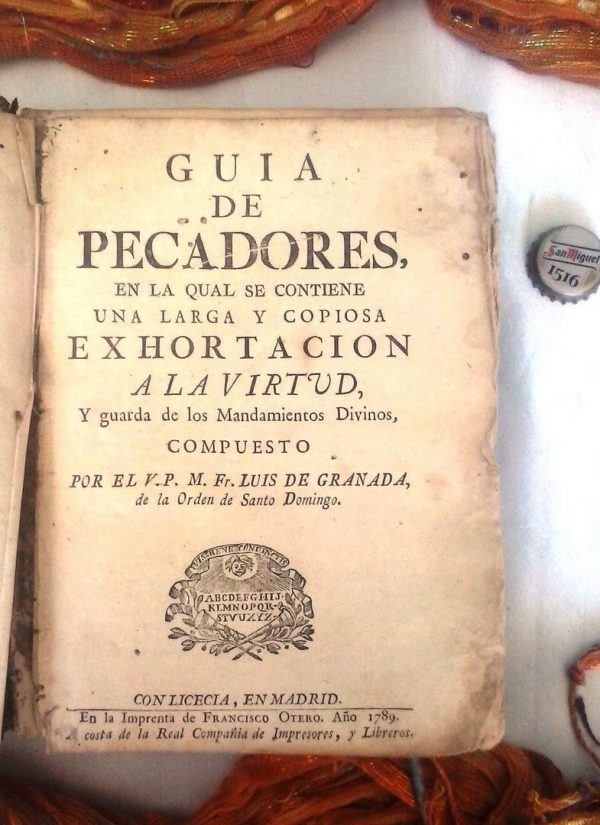 CENTENARIO LIBRO “GUÍA DE PECADORES” AÑO 1789: Fray Luis de Granada vivió entre 1504 y 1588. Fue perseguido por la Inquisición, pero se le beatificó en Granada en 1997. Tienen ante ustedes un libro de 1789 (fecha de la Revolución Francesa) que trata la virtud cristiana: una verdadera joya histórica y un magnífico tesoro de librero. Evidentemente no se encuentra en buen estado, pero sus páginas se leen con facilidad y no se desprenden. Por desgracia un gusanillo comiendo comiendo papel le hizo varios agujeros a las páginas y por éso el libro ha perdido bastente valor… Tiene 495 páginas, mide 21 cm de alto x 15 de ancho Ref. Libros nº 38
