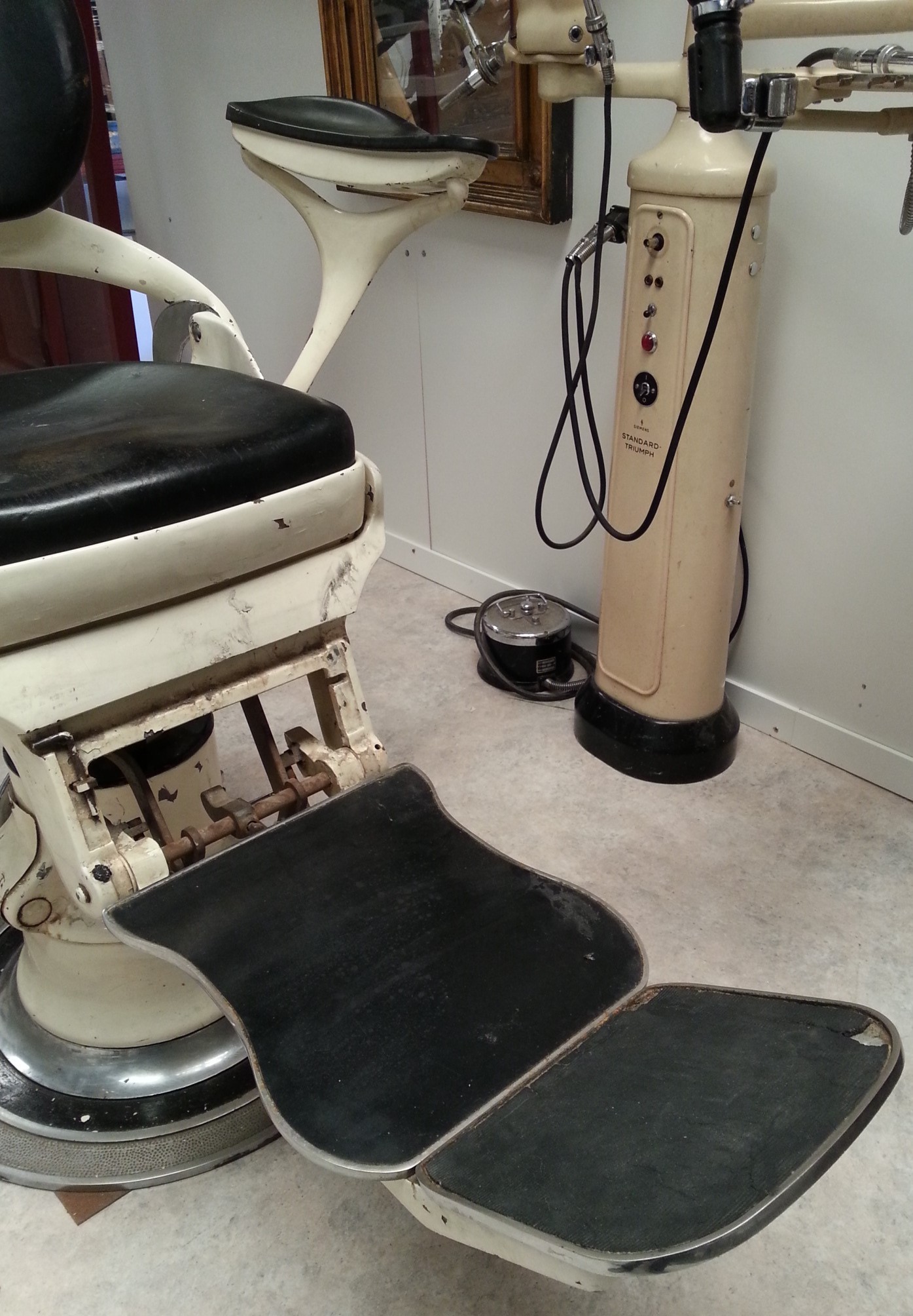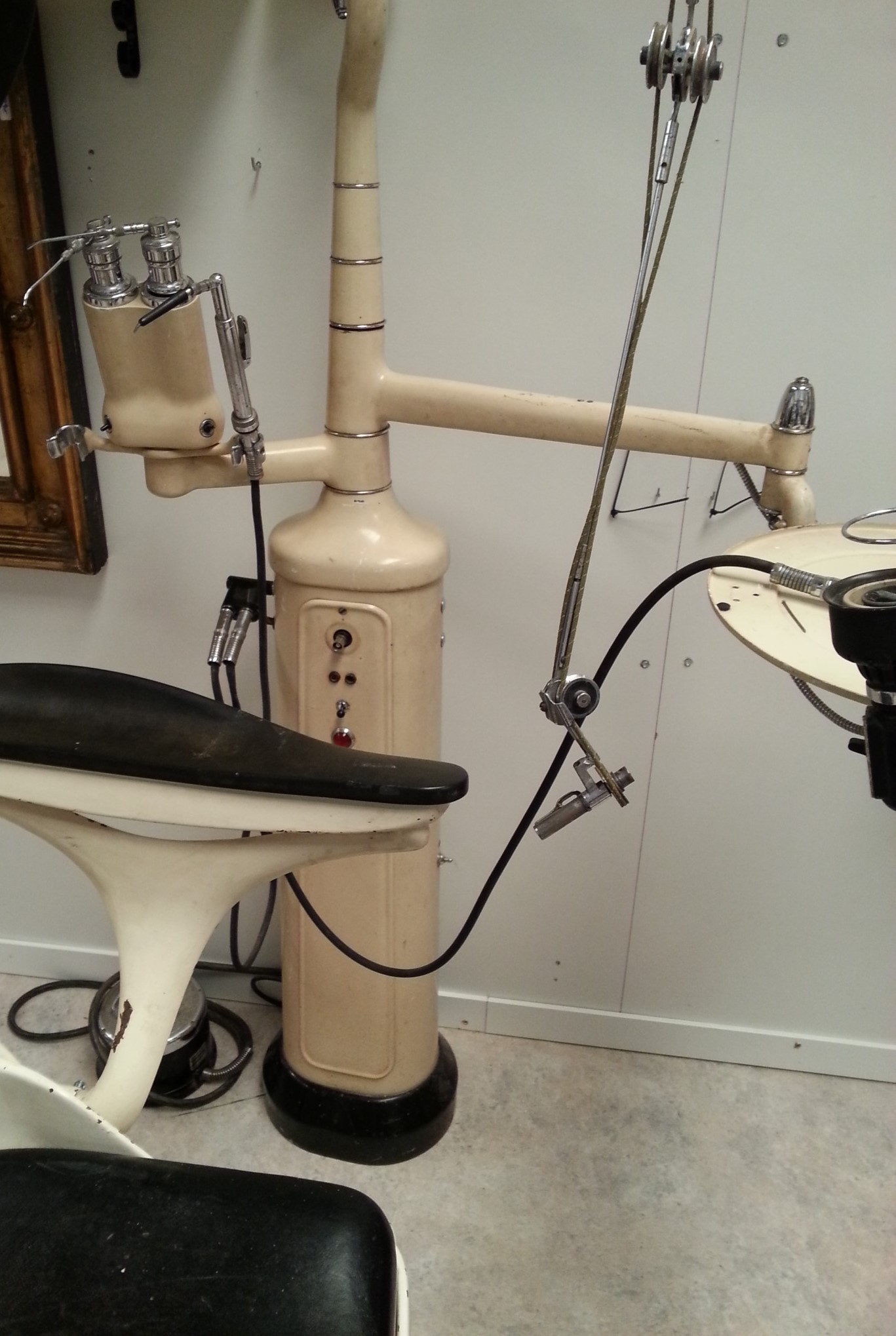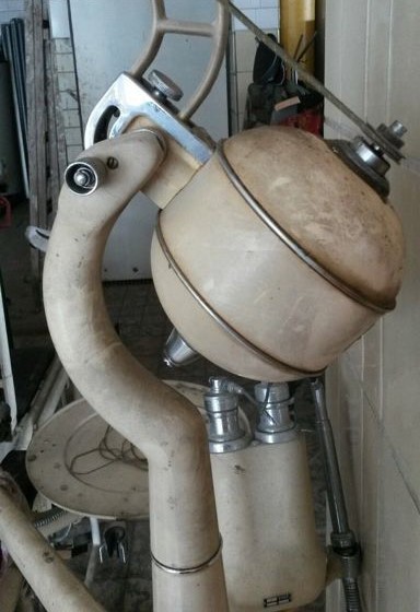 Se trata de un antiguo taladro dental utilizado durante los años 60. Pertenecía a una clínica alemana y funcionaba con electricidad pero ya solo servirá para decoración, atrezzo o coleccionismo.