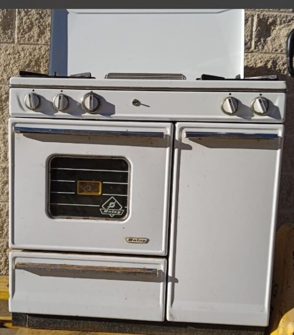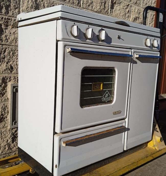 Emblemática pieza de decoración es esta cocina de gas. Sigue funcionando. También disponemos de bombonas de gas vacías de las de toda la vida de color naranja,