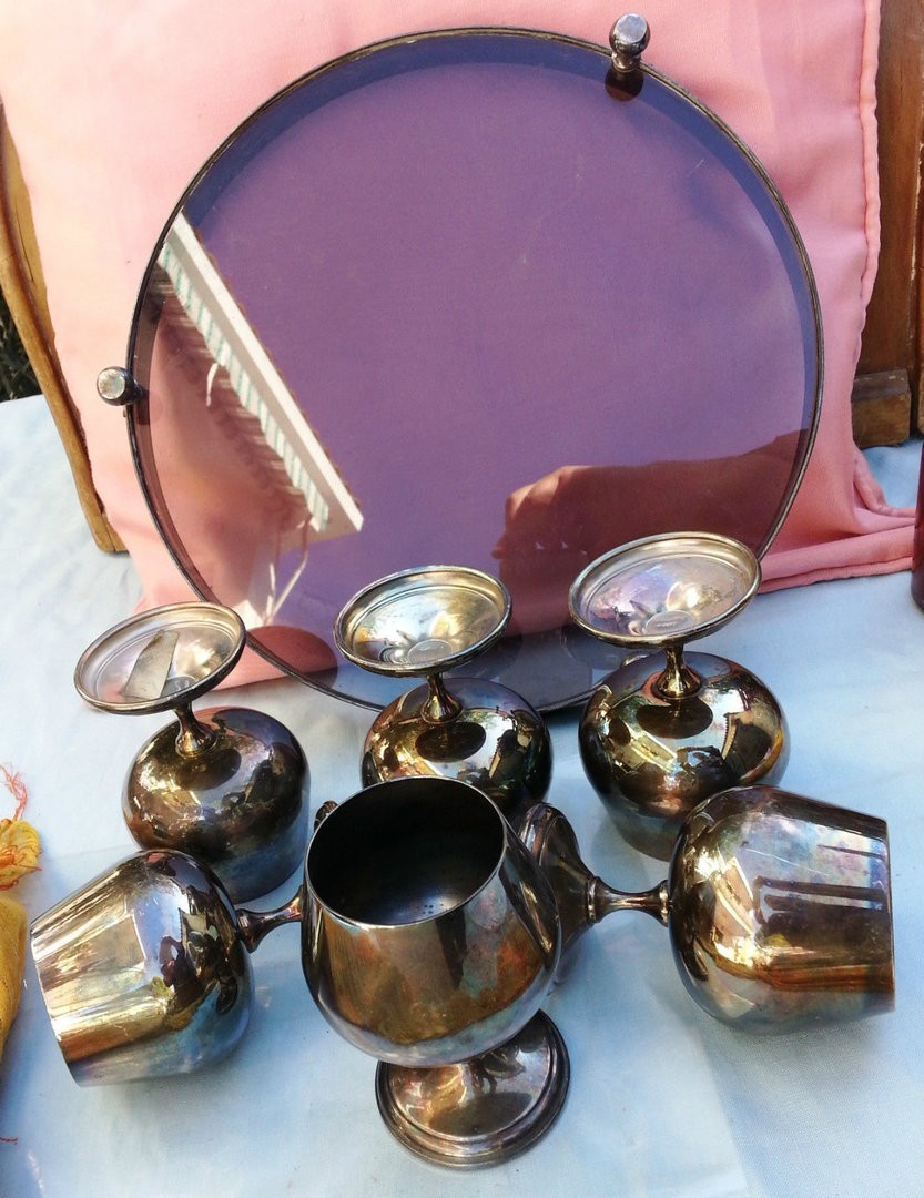 Copas en alpaca. Años 70. 6 copas + bandeja en alpaca y cristal