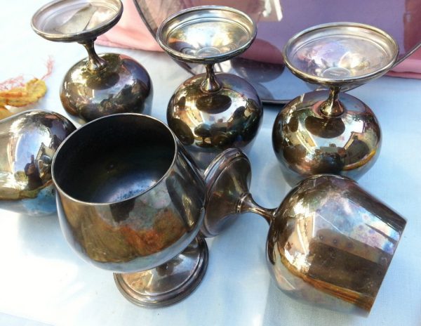 Conjunto en Alpaca. Están viejas estas copas pero no muy deterioradas por el paso del tiempo. Tienen sus grabados del fabricante en la base de cada copa.