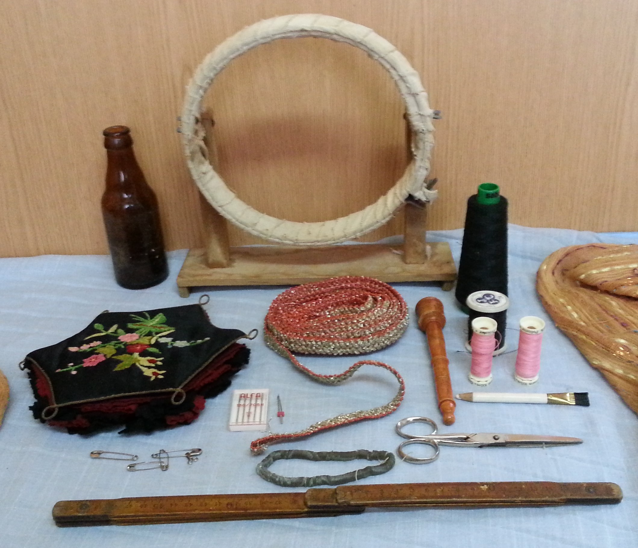 Conjunto compuesto por: Marco bastidor de madera, porta-agujas, tijeras, alfiletero, metro de medir y diferentes utensilios. Para reutilizar, atrezzo o decoración. Se encuentran en buen estado, como puede apreciarse en las fotografías.