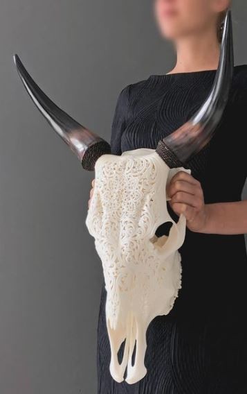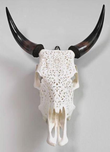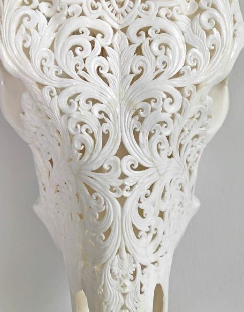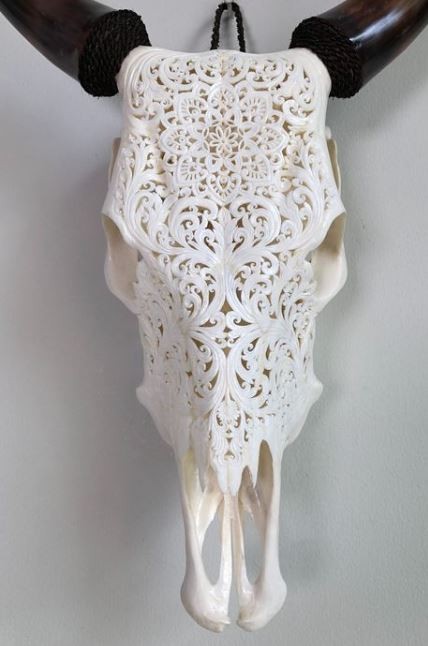 Cráneo de vaca blanco con su cornamenta tallado a mano. Relizado por artesanos que pasaron el antiguo arte del tallado entre generaciones.