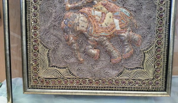 Impresionante obra hecha a mano en tela bordada representando una escena de la India con indio montado en elefante.