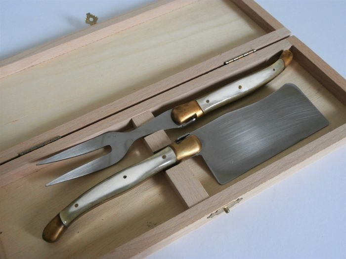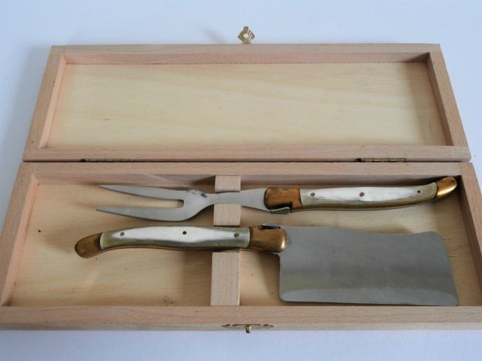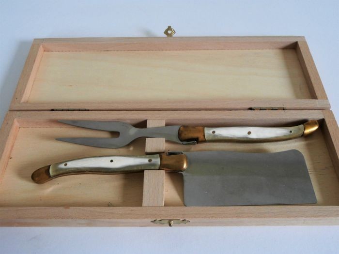 Gran conjunto en perfecto estado de los años 50-60 de origen francés con cuchillo especialmente bien conservado y trinchador conjuntado. Todo ello en su caja de madera original.