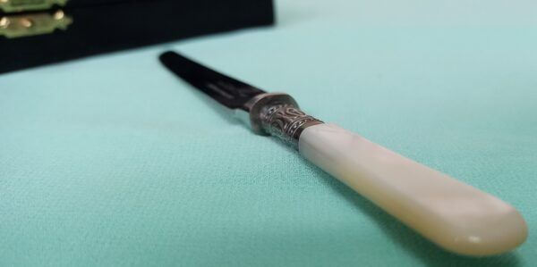 Hermoso juego de cubiertos antiguos con asidera nacarada en su caja original. Para 6 comensales.