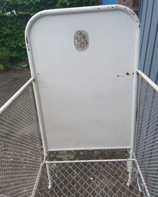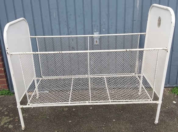 Esta cuna metálica de la década de los años 30 es un precioso objeto de colección, atrezzo y decoración.
