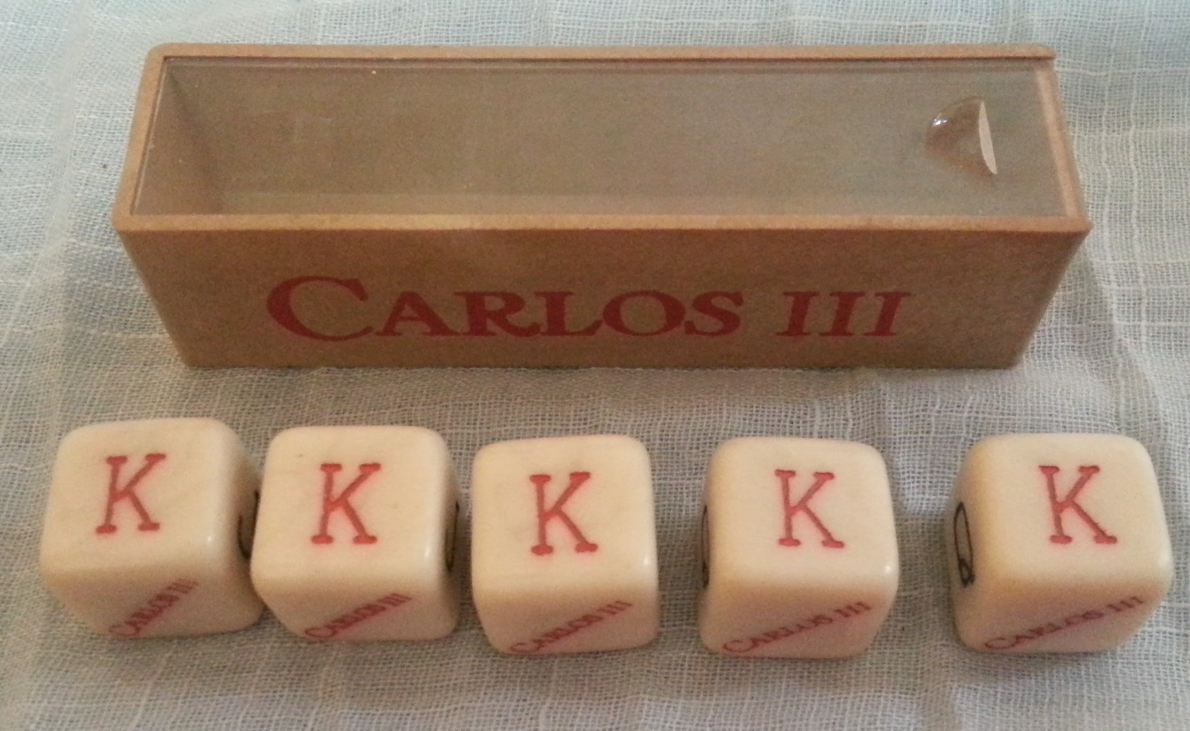 Cajita de dados de póker  de la marca publicitaria Carlos III.