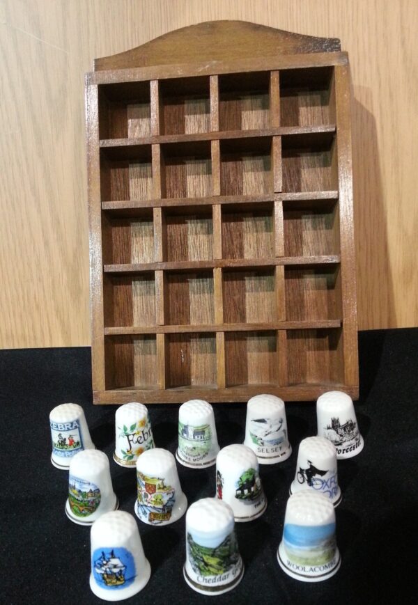 Dedales de colección. 12 unidades. Incluye su expositor en madera para 20 dedales.