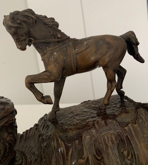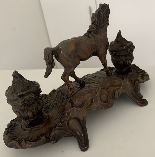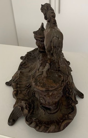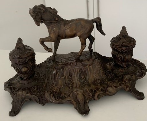Escribanía centenaria en zinc. Magnífica pieza de escritorio. Con figura de caballo.