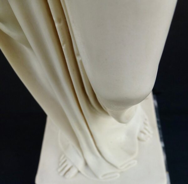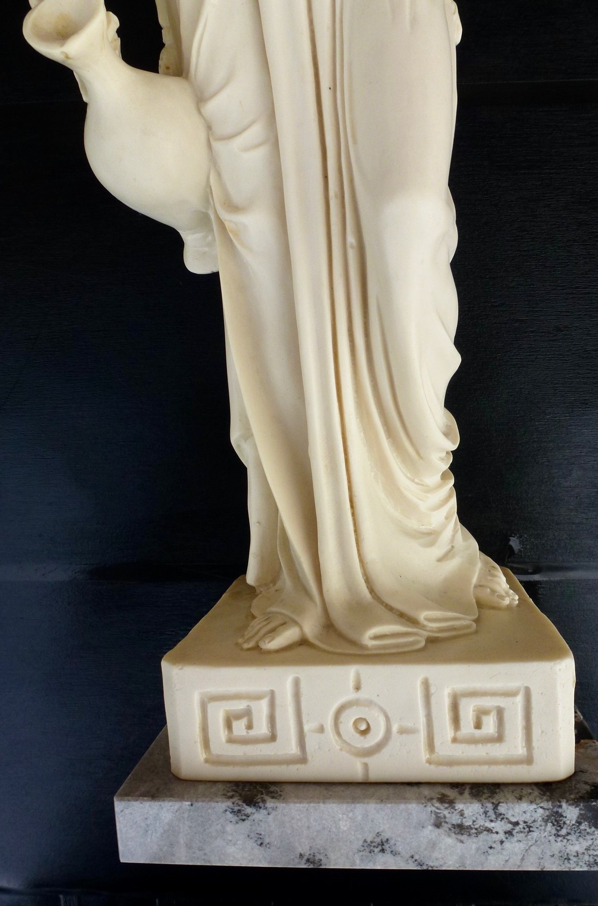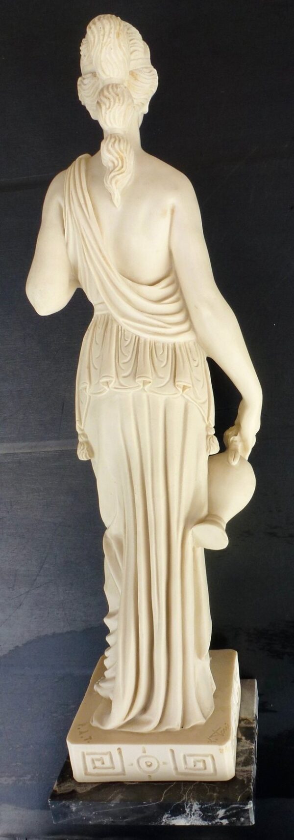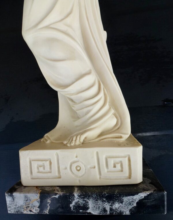 Buen estado de esta escultura de Hebe, la Diosa de la Juventud. Realizada en compuesto de mármol con peana también en mármol gris.