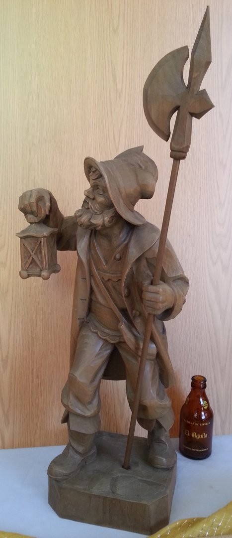 Hermosa escultura tallada de un sereno con su alabarda. Fantásticos detalles acompañan a esta pieza que hacen de ella una obra maravillosa. Aproximadamente de los años 60 tiene grabado la firma de su autor en la base G. P. MERAN.