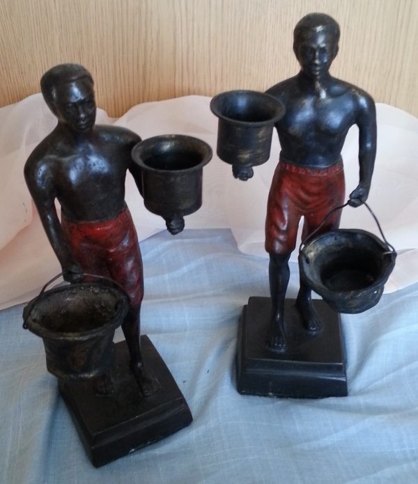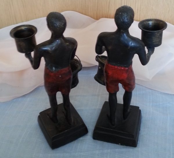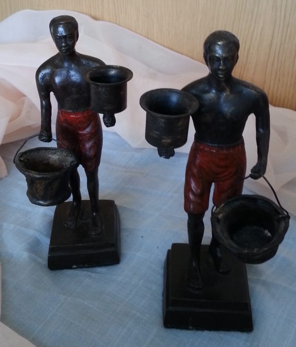 Fabricadas en los años 50, esta pareja de esculturas  en pesado bronce policromado, servirán como candelabros para su recibidor o escritorio. Mucha calidad en estas antiguas piezas.