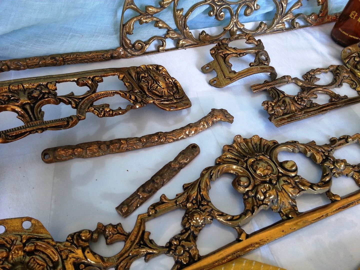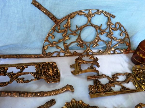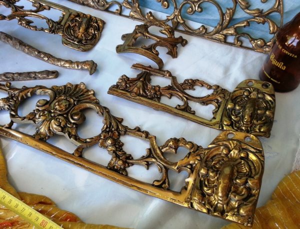 FANTÁSTICAS Y VIEJAS PLACAS DE BRONCE DECORADAS DE VIEJA MESA. ALGUNAS ROTAS: Algunas de estas piezas están completas otras están rotas y confío en que podrán reutilizarse. Por favor, observen las fotos. En total son 7 elementos en el que la pieza principal que está completa mide 54 cm de largo * 12 cm de ancho. Ref. nº 1-QQQ