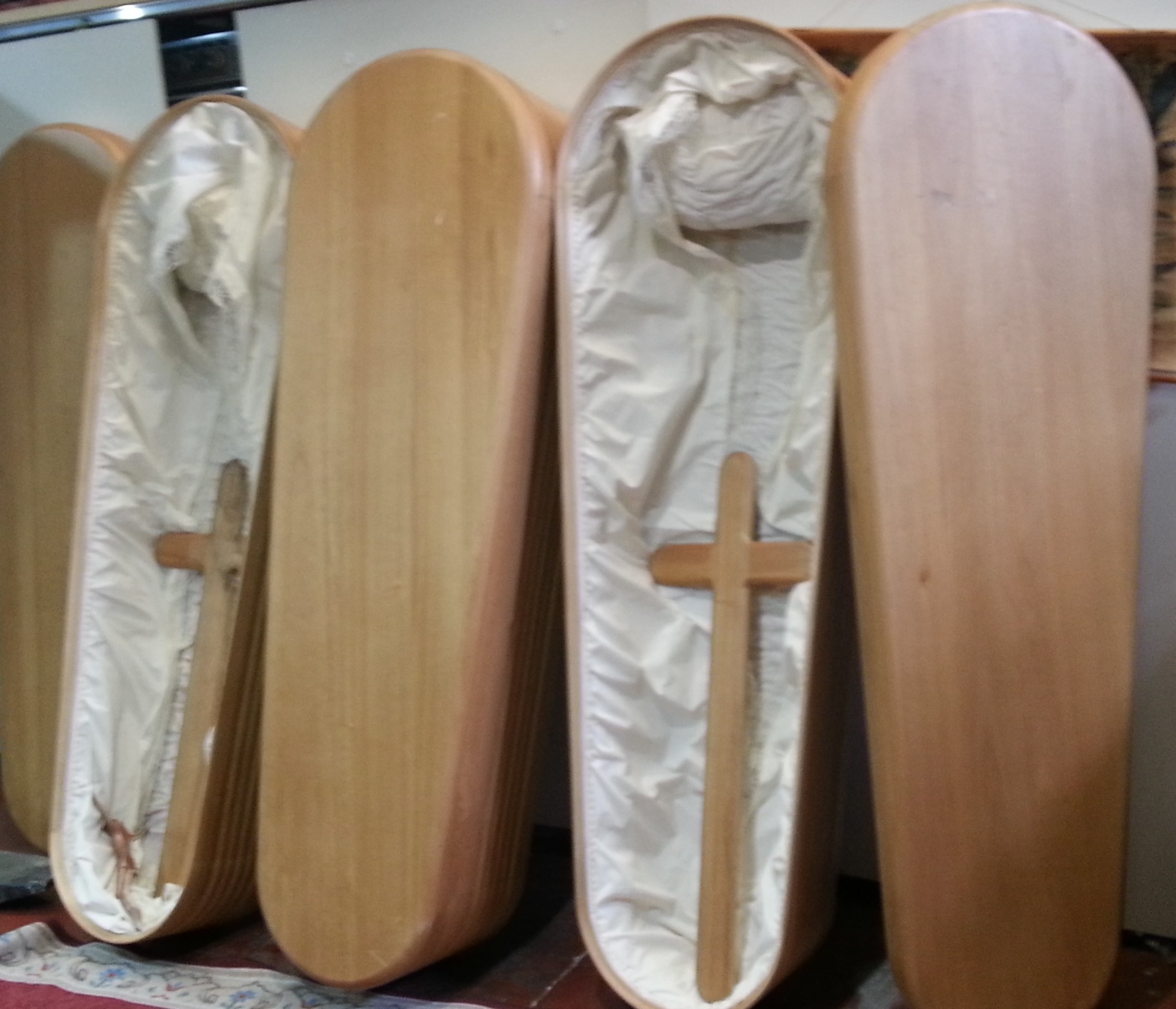 Las fotos muestran algunos de nuestros ataudes. MIde cada uno aprox. 1,92 m de largo * 62 cm de ancho.