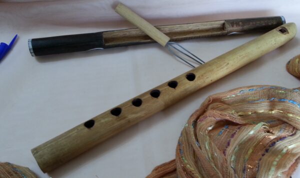 Flauta y Rascador. Instrumentos musicales en madera. Origen Colombiano.
